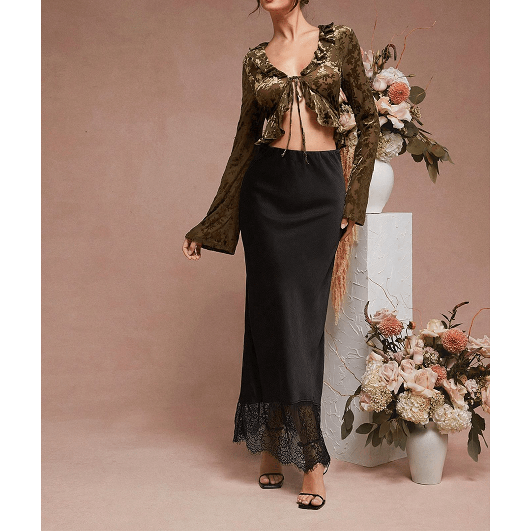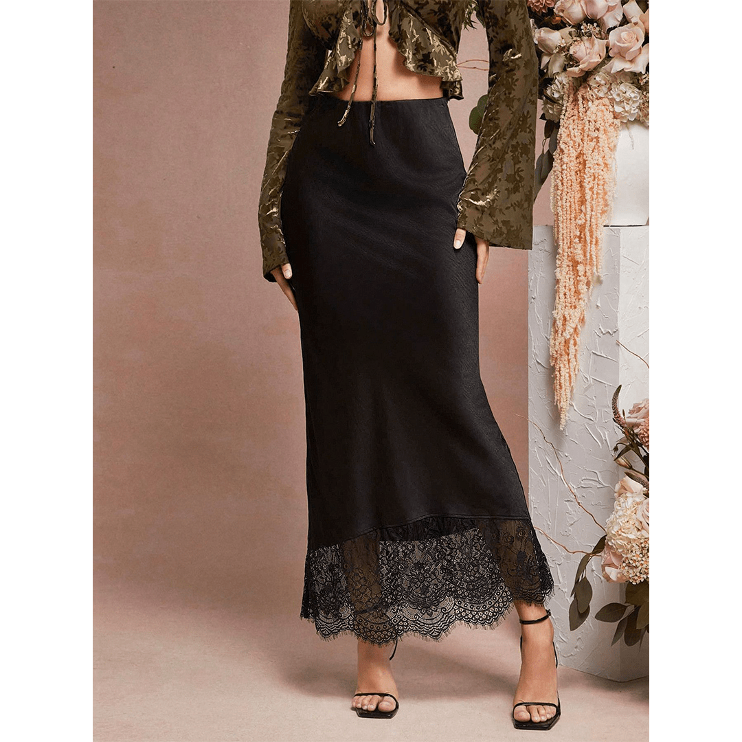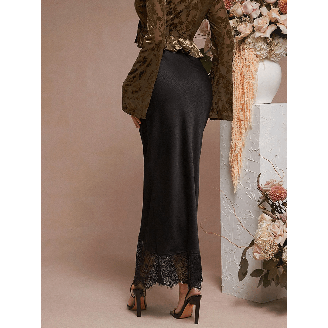 Acetate Satin Lace Trim Mermaid Midi Skirt Black