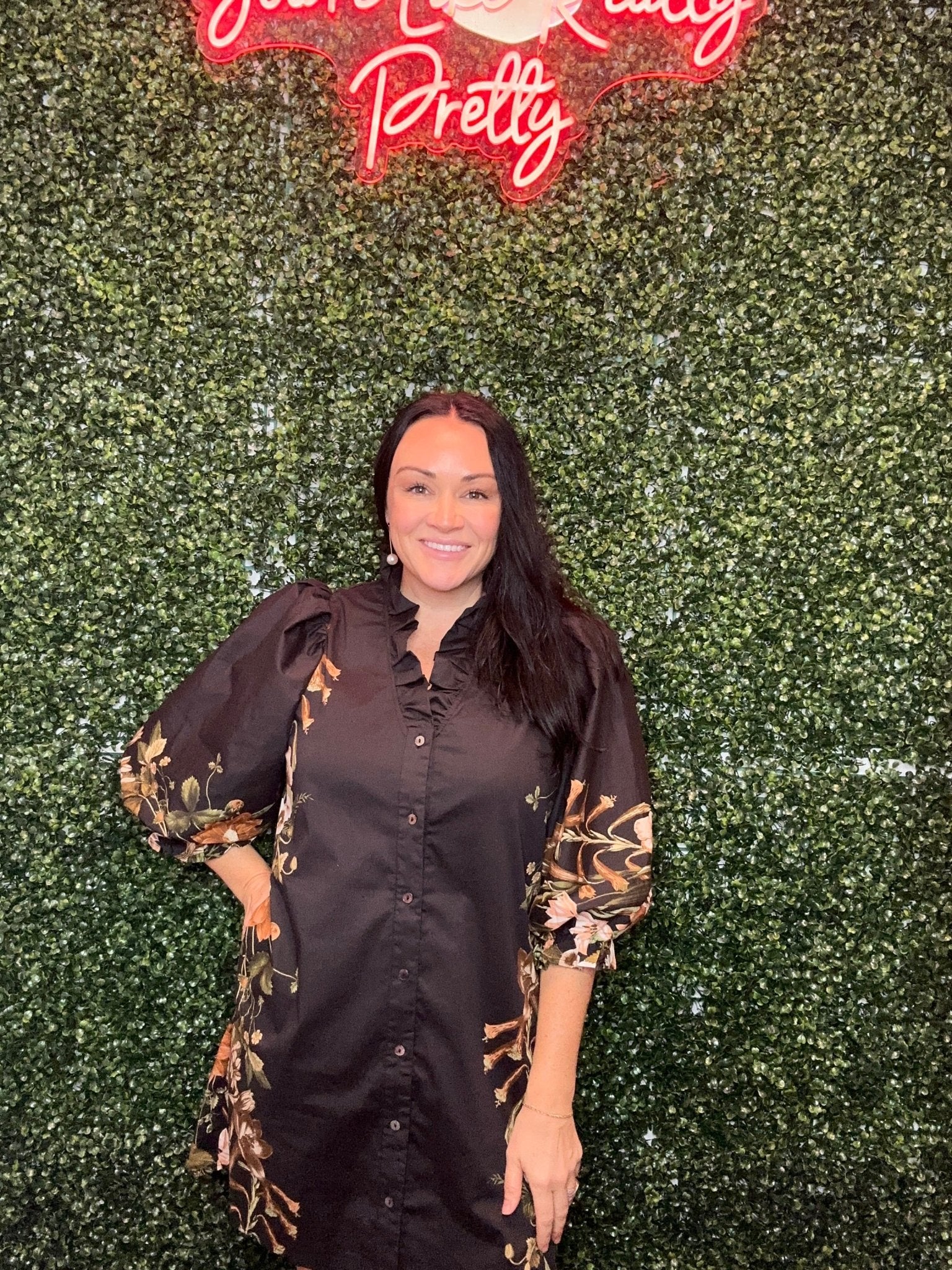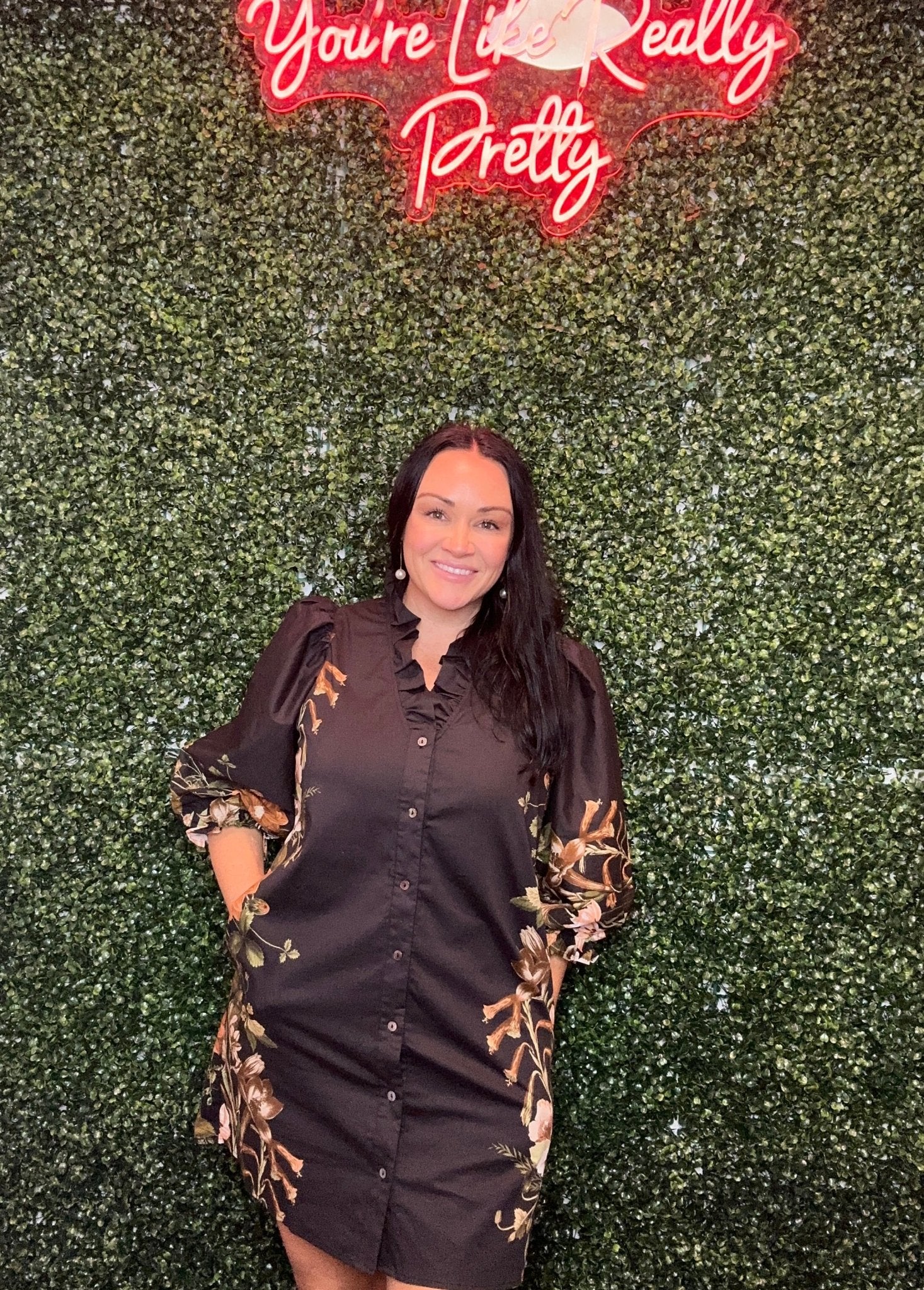 Bring understated elegance to your wardrobe with the Brown Sugar Blooms Dress. This black midi dress is adorned with soft shades of brown floral prints, creating a warm and sophisticated look perfect for any occasion. The button-up front adds classic charm, while the 3/4 sleeves offer a flattering, versatile style for year-round wear.