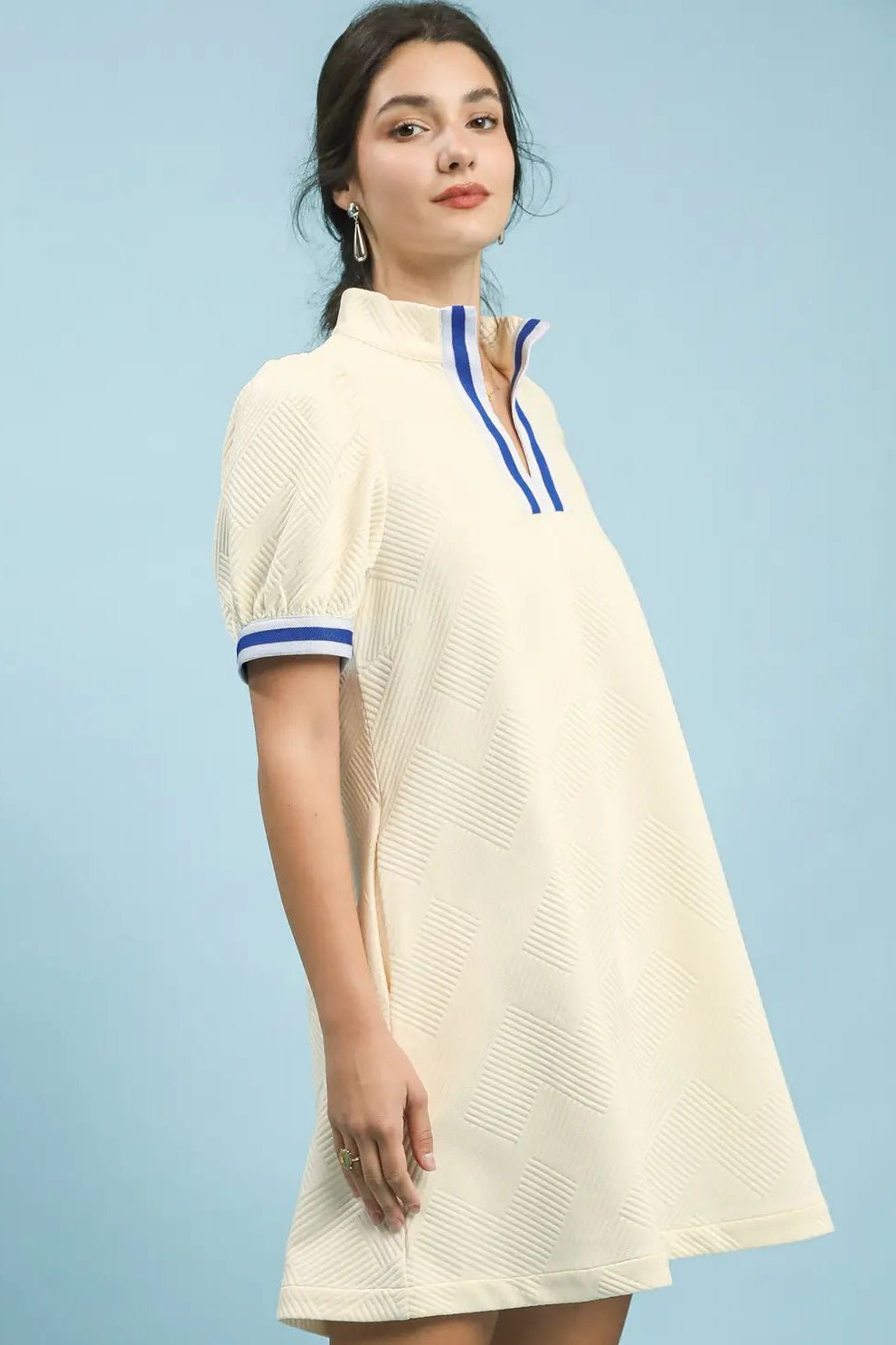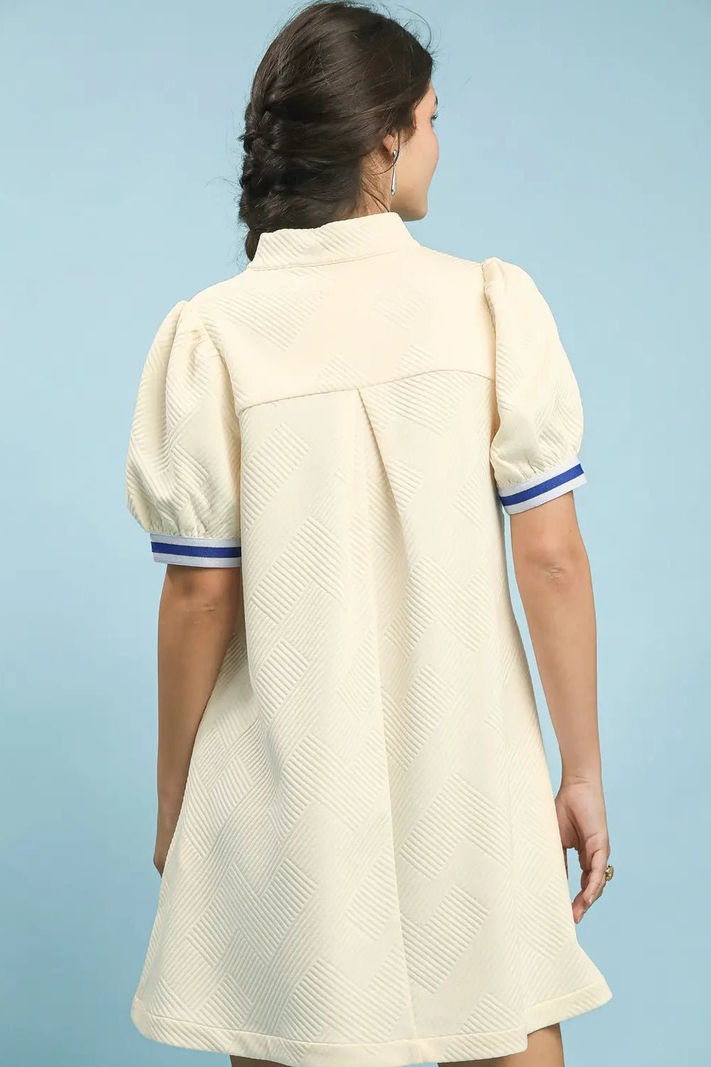 The Cream Belle Jacquard Mini Dress is a sophisticated yet playful addition to your wardrobe. Crafted from textured jacquard fabric, this dress features a high neck with an open collar and short puff sleeves that add a touch of femininity. A contrast stripe band trim creates subtle visual interest, while the unlined design keeps it light and easy to wear. Falling to a chic mini length, this dress is perfect for brunches, daytime events, or evening outings where understated elegance meets modern charm.