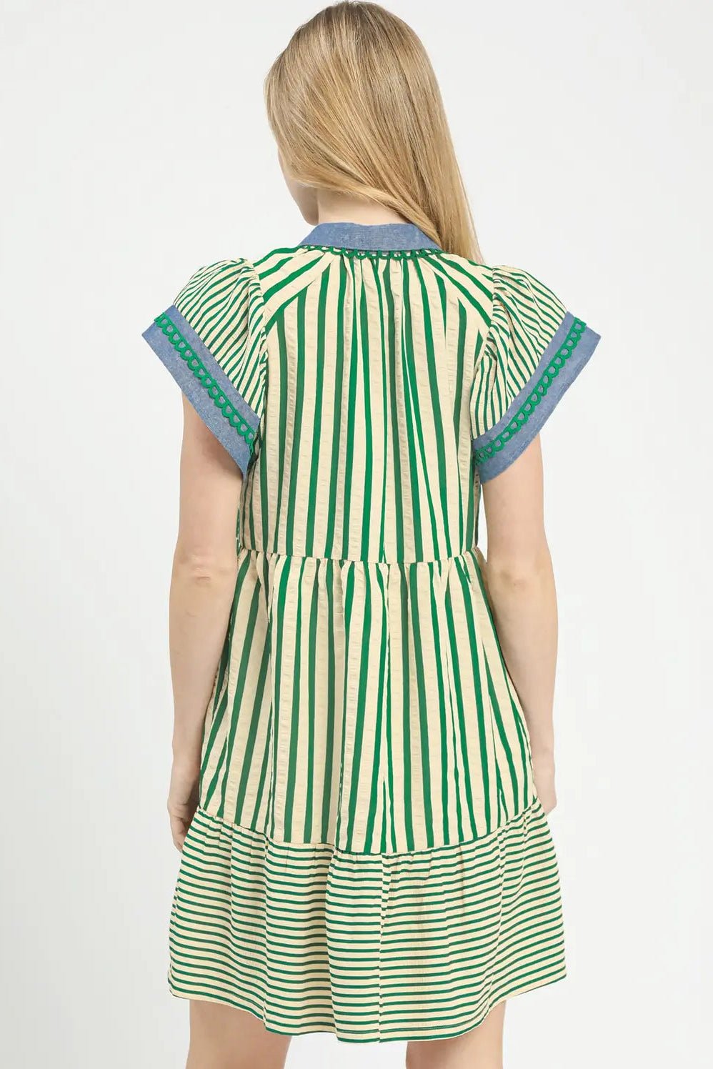 The Green Belle Stripe Flutter Dress blends classic charm with an easy, feminine silhouette. Featuring a fresh mixed stripe pattern in shades of green, this dress is designed with a flattering button-front and soft flutter sleeves for a light, airy feel. Thoughtful contrast detailing adds visual interest, while the tiered babydoll shape creates a relaxed, flowy fit. Fully lined for comfortable wear, it’s an effortless go-to for daytime outings, casual gatherings, or whenever you want polished style with a touch of charm.