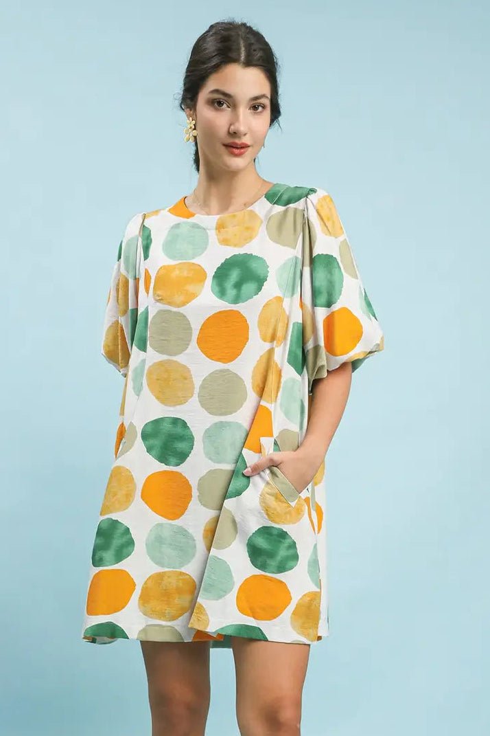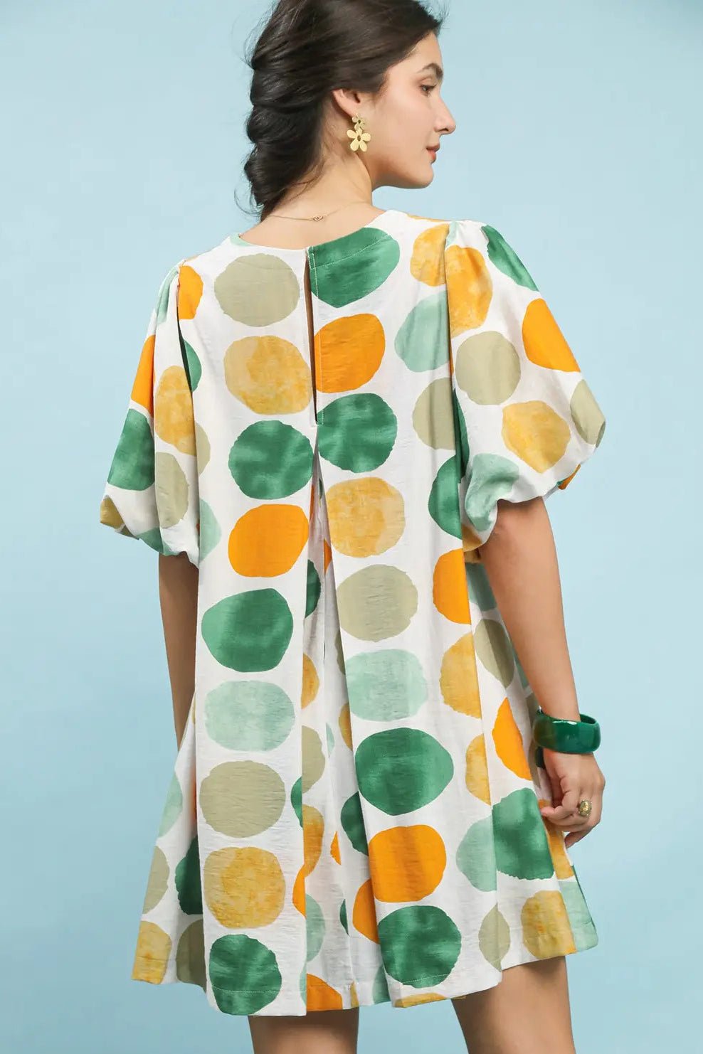 The Green Mix Daydream Dot Dress transforms your everyday style with whimsical charm and polished sophistication. Featuring a classic round neckline and delightful bubble short sleeves, this tunic dress showcases a vibrant abstract dot pattern in refreshing green tones. Contrast detailing adds personality and visual depth, while the fully lined construction guarantees comfort and confidence with every wear. Versatile and effortlessly stylish, it's your go-to piece for casual adventures, weekend brunches, or whenever you're craving a dash of playful elegance.