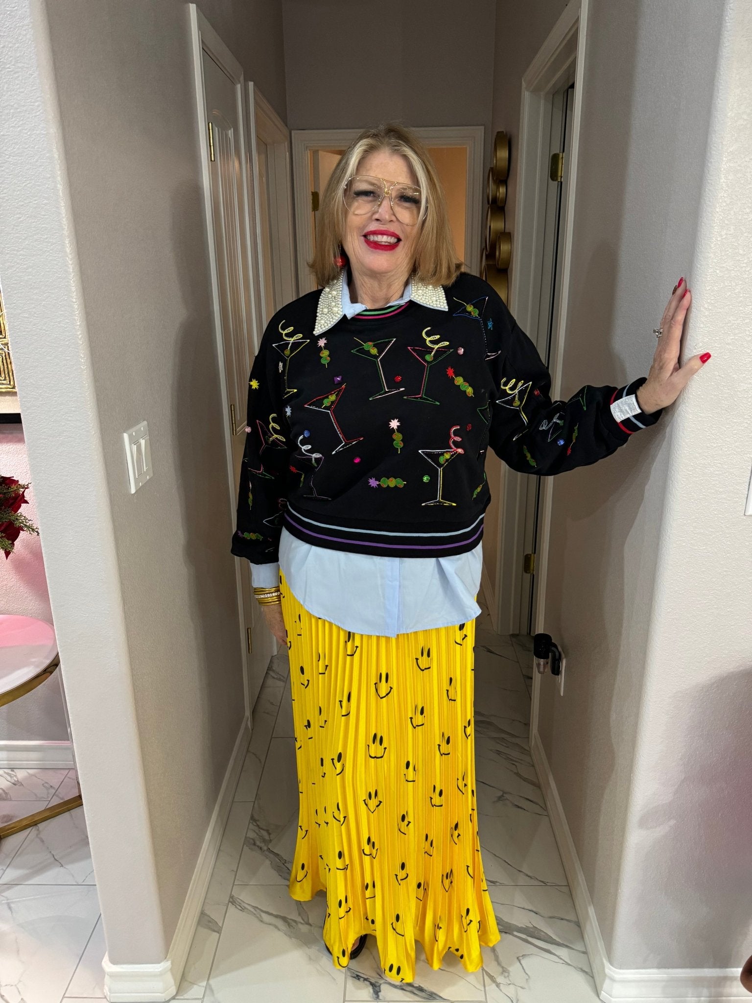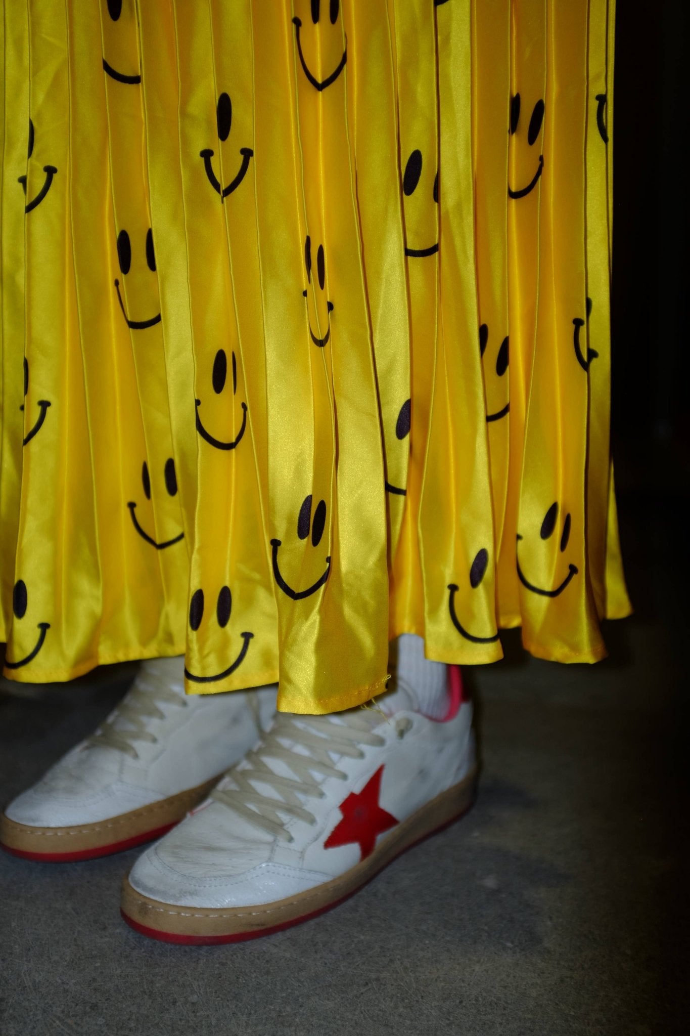 Spread pure positivity with the Happy To Be Here Smiley Pleated Skirt—your new favorite mood ring in fabric form. This cheerful piece features an all-over smiley face print on a vibrant yellow background that instantly lifts any outfit. The pleated design creates beautiful movement while the stretchy elastic waistband keeps you feeling relaxed and supported all day long. Made from 100% polyester with a true-to-size, relaxed fit, it's the perfect blend of comfort and personality. Whether you're running errands or making a statement, this skirt proves that good vibes are always in style.