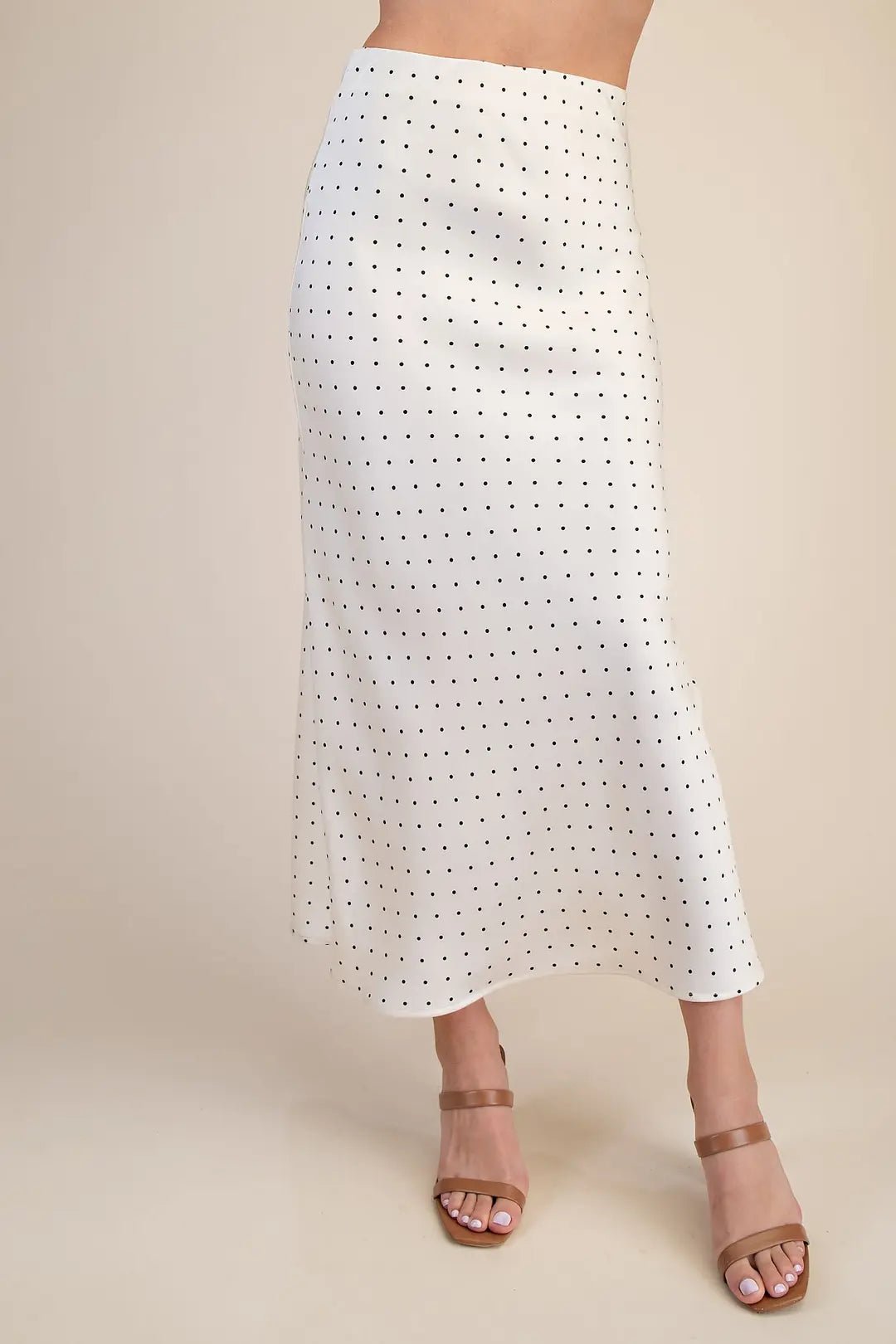 The fluid silhouette falls gracefully to a midi length, creating effortless movement and a feminine drape. Perfect for dressing up or down, the Polka Charm Midi Skirt pairs beautifully with tucked-in blouses, fitted tees, or cozy knits for versatile styling from day to night.