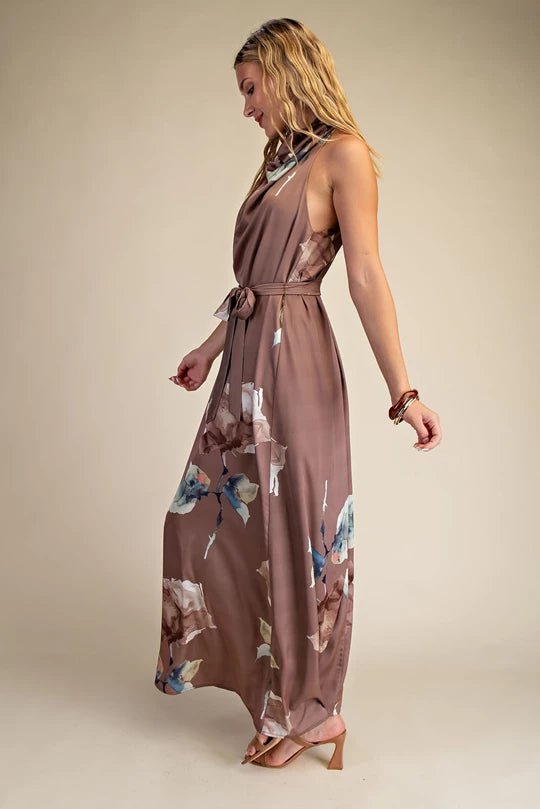 Meet The Halter Muse, where timeless elegance meets effortless allure. Crafted from lustrous satin in a soft mocha hue, this maxi dress drapes beautifully with every movement. A halter neckline highlights your shoulders, while the delicate floral print adds a romantic touch. The flowing silhouette and subtle sheen create a look that’s both refined and captivating—perfect for garden soirées, weddings, or sunset dinners.