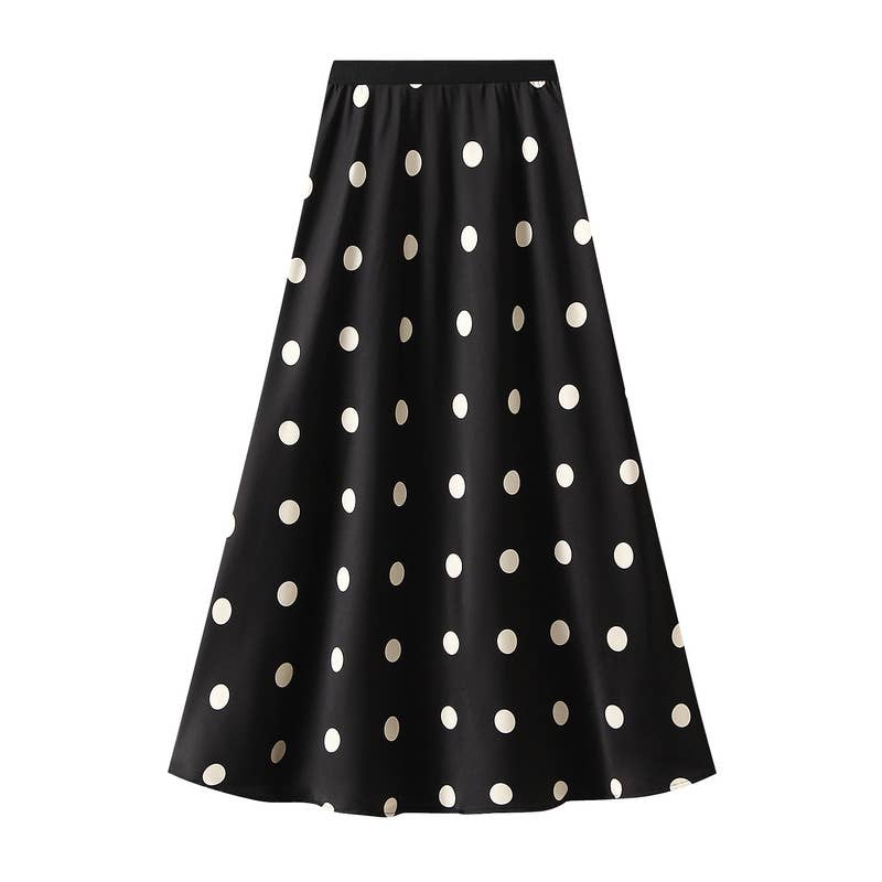 Classic polka dot design in two size options large dots & small dots -High-waisted with an elastic waistband - Midi-length, flowy A-line cut -Pairs well with blouses, tees, or sweaters for any season