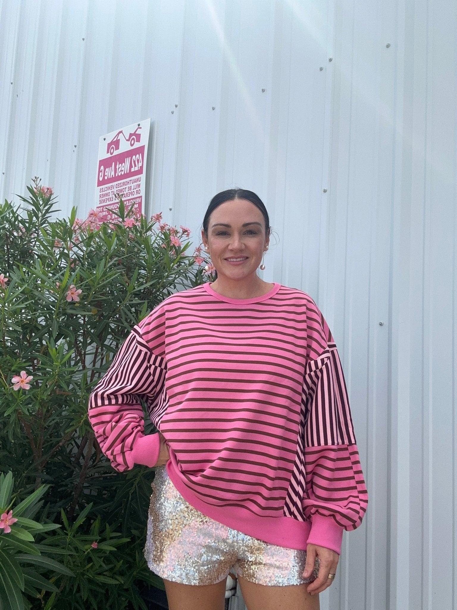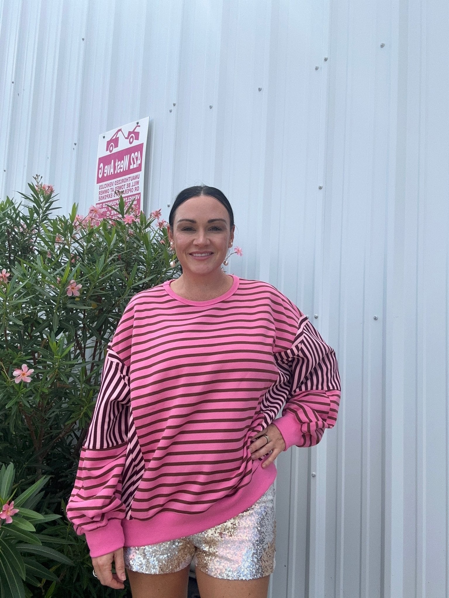 The Bubblegum Stripe Pullover is the perfect blend of playful and cozy. Featuring bold pink and brown stripes with a mix of horizontal and vertical patterns, this oversized sweatshirt brings a fun twist to classic comfort.