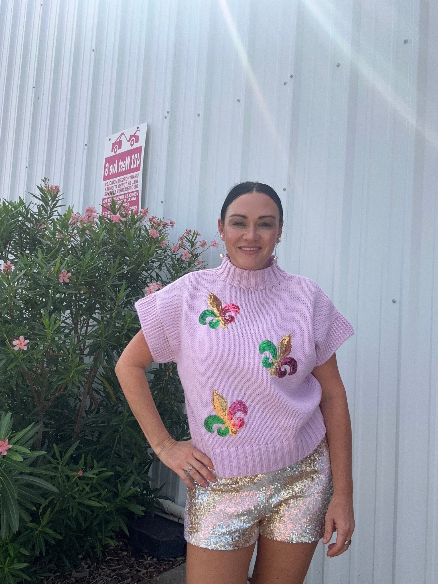 Add a touch of carnival charm to your wardrobe with the Mardi Gras Fleur Turtleneck Sweater. This light purple short sleeve knit features a cozy turtleneck and a standout embroidered, sequin fleur-de-lis in classic Mardi Gras colors—green, gold, and purple. Soft, stylish, and easy to layer, it's the perfect piece for parades, parties, or bringing festive flair to your everyday look.