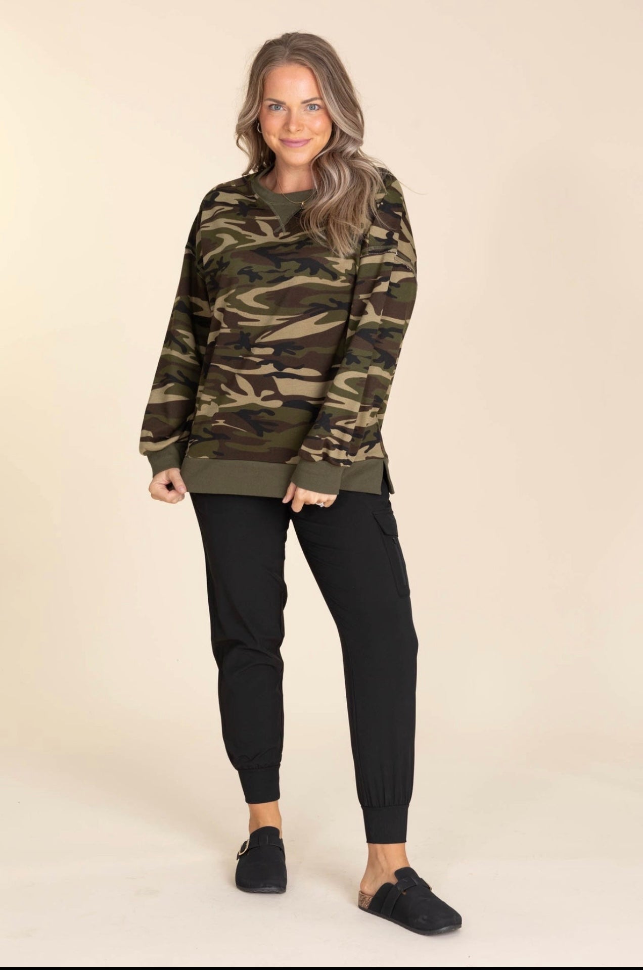 Effortlessly cool and endlessly wearable, the Camo Crush Pullover features a classic camouflage print with a modern, feminine twist. Designed with a soft, cozy feel and a relaxed fit, this pullover is perfect for everyday styling. Easy to dress up or down, it pairs perfectly with denim, leggings, or layered over basics for a laid-back yet stylish look. A must-have staple for anyone who loves camo with a touch of attitude.