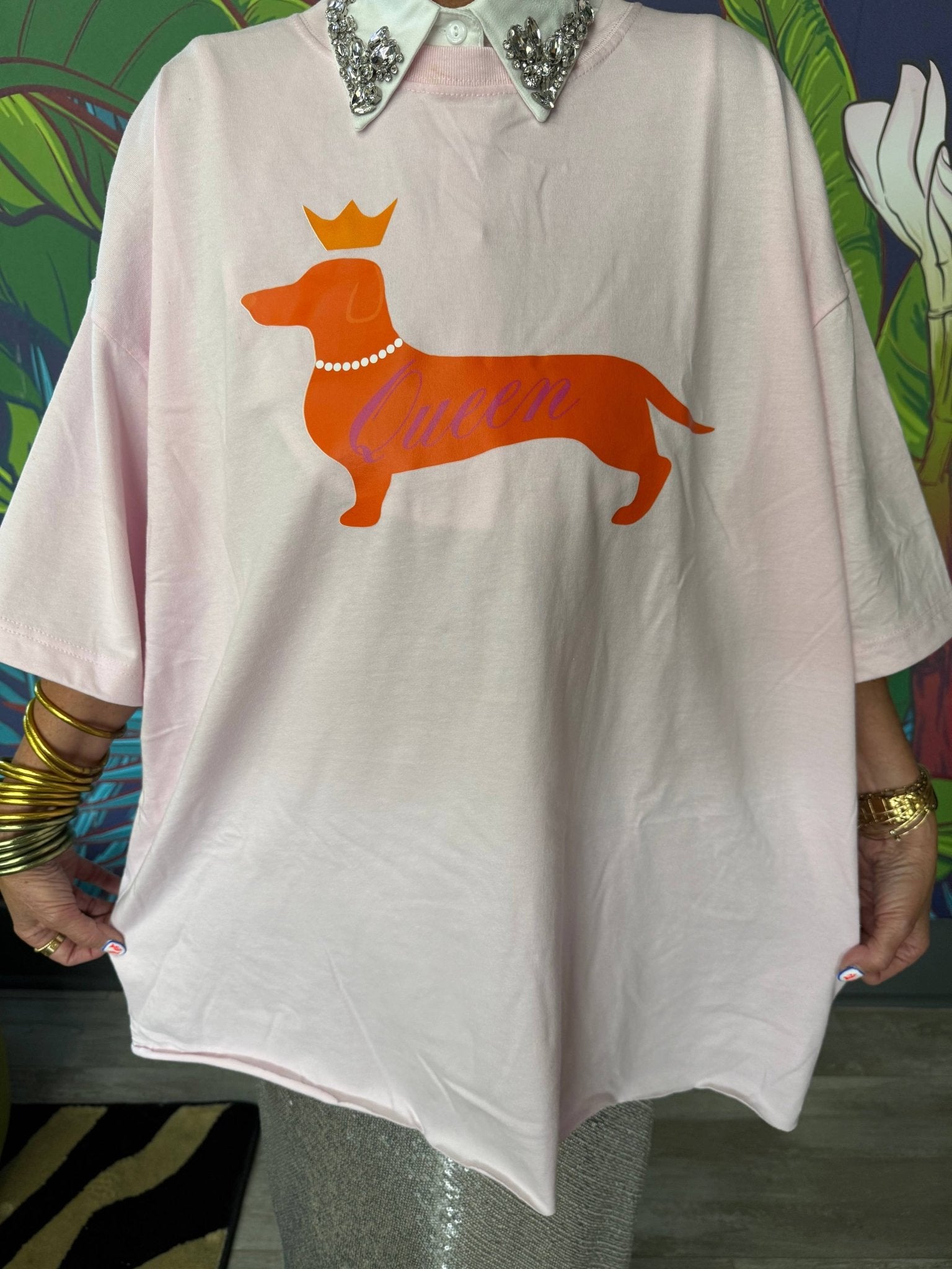 Brighten your casual wardrobe with the Queenie Weenie Graphic Tee, featuring an adorable weenie dog sporting a chic crown and a pearl necklace. This playful design adds a fun and stylish twist to a classic pink tee, perfect for dog lovers who want to showcase their quirky side with comfort and flair.