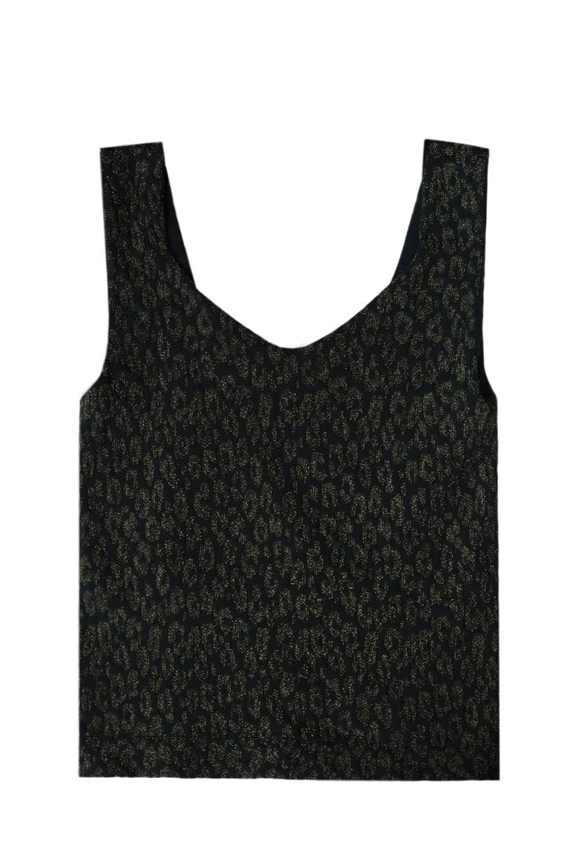 Turn heads effortlessly with the Black Lurex Leopard Tank Top. This seamless v-neck tank sparkles with golden leopard lurex threads, delivering a sleek, eye-catching fit. Its rich black color adds warmth and versatility, making it perfect for layering or wearing solo when you want to shine with playful confidence.