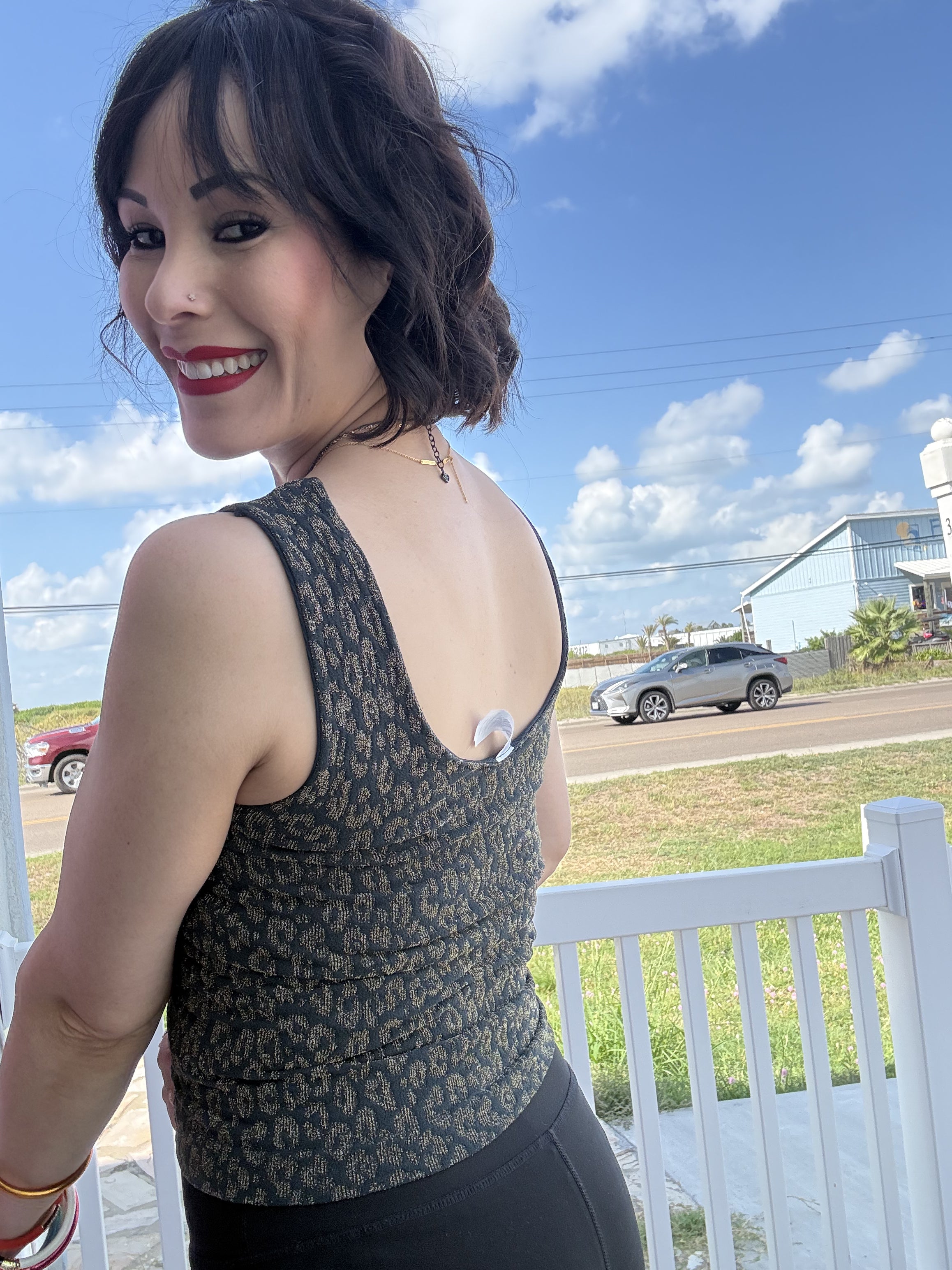 Turn heads effortlessly with the Forest Night Lurex Leopard Tank Top. This seamless v-neck tank sparkles with golden leopard lurex threads, delivering a sleek, eye-catching fit. Its rich blue color adds warmth and versatility, making it perfect for layering or wearing solo when you want to shine with playful confidence.