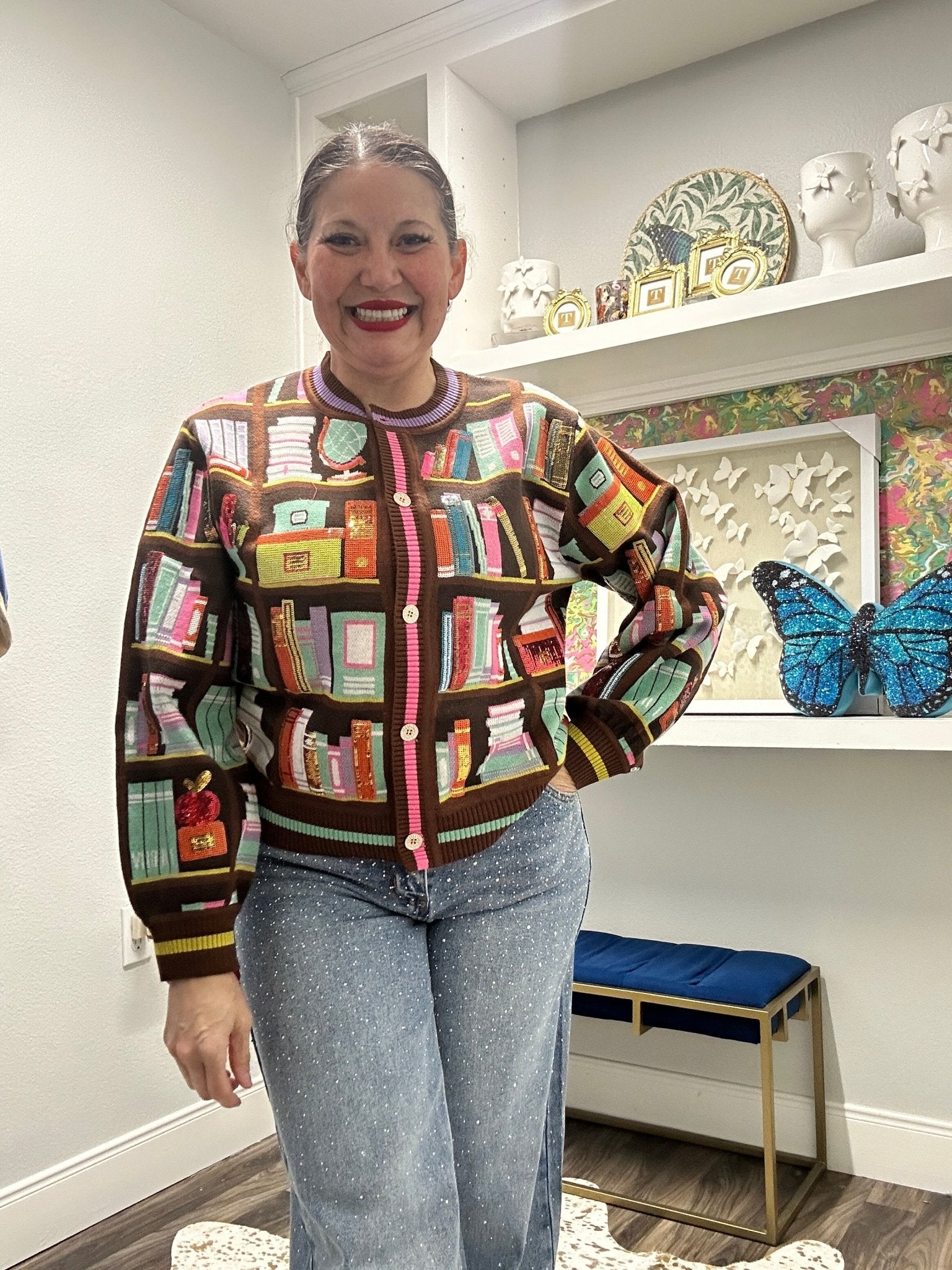 The Queen of Sparkles Brown Multi Library Brooks Cardigan brings effortless elegance to your everyday wardrobe. Crafted with a rich brown base and vibrant multi-colored library-inspired accents, this cardigan layers beautifully over dresses, tees, or sweaters. The Brooks silhouette offers a flattering fit with thoughtful construction that transitions seamlessly from casual days to polished occasions. Perfect for adding warmth and personality to any outfit, this piece celebrates the art of storytelling through its distinctive design details.