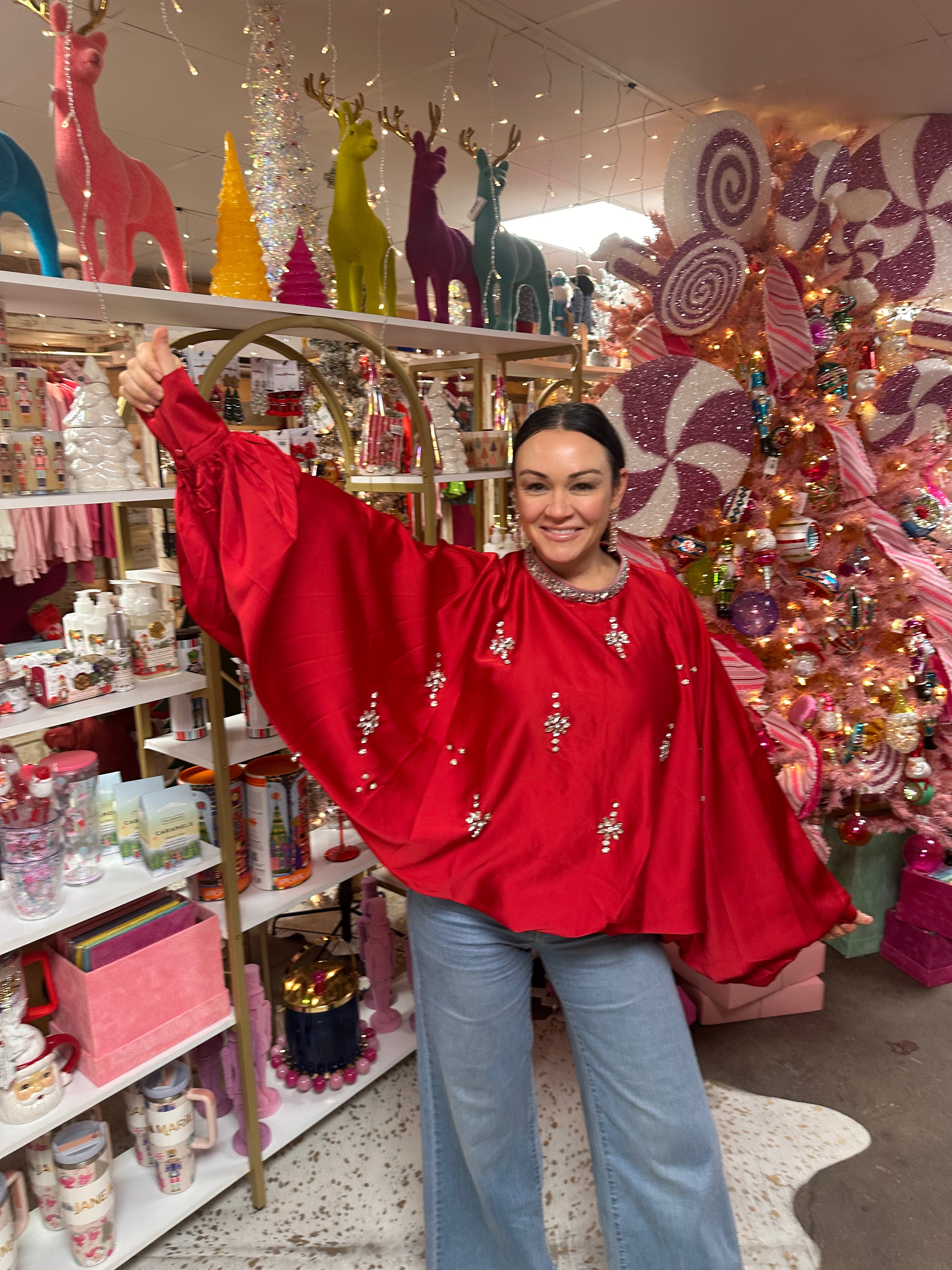 Turn heads in this luxe silky shirt, designed with dazzling rhinestone details throughout. The rhinestone-trimmed collar gives it that high-end, statement-making finish. Pair it with denim for a chic casual look or dress it up for your next night out — either way, all eyes will be on you. One Size Fits Most.