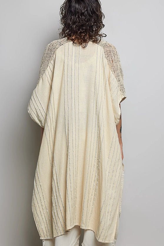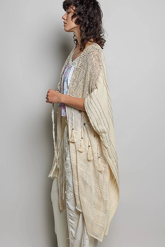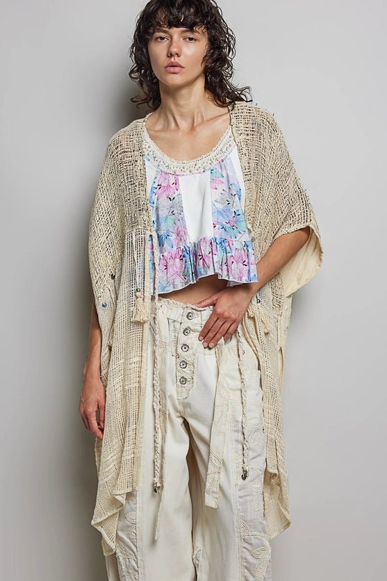 A short-sleeve, relaxed-fit midi cardigan top crafted from woven cotton. Featuring subtle sequin accents, tassel loop details, and side open slits, this cardigan combines playful charm with effortless elegance. Perfect for layering or statement styling, it adds texture, movement, and feminine sophistication to any outfit.