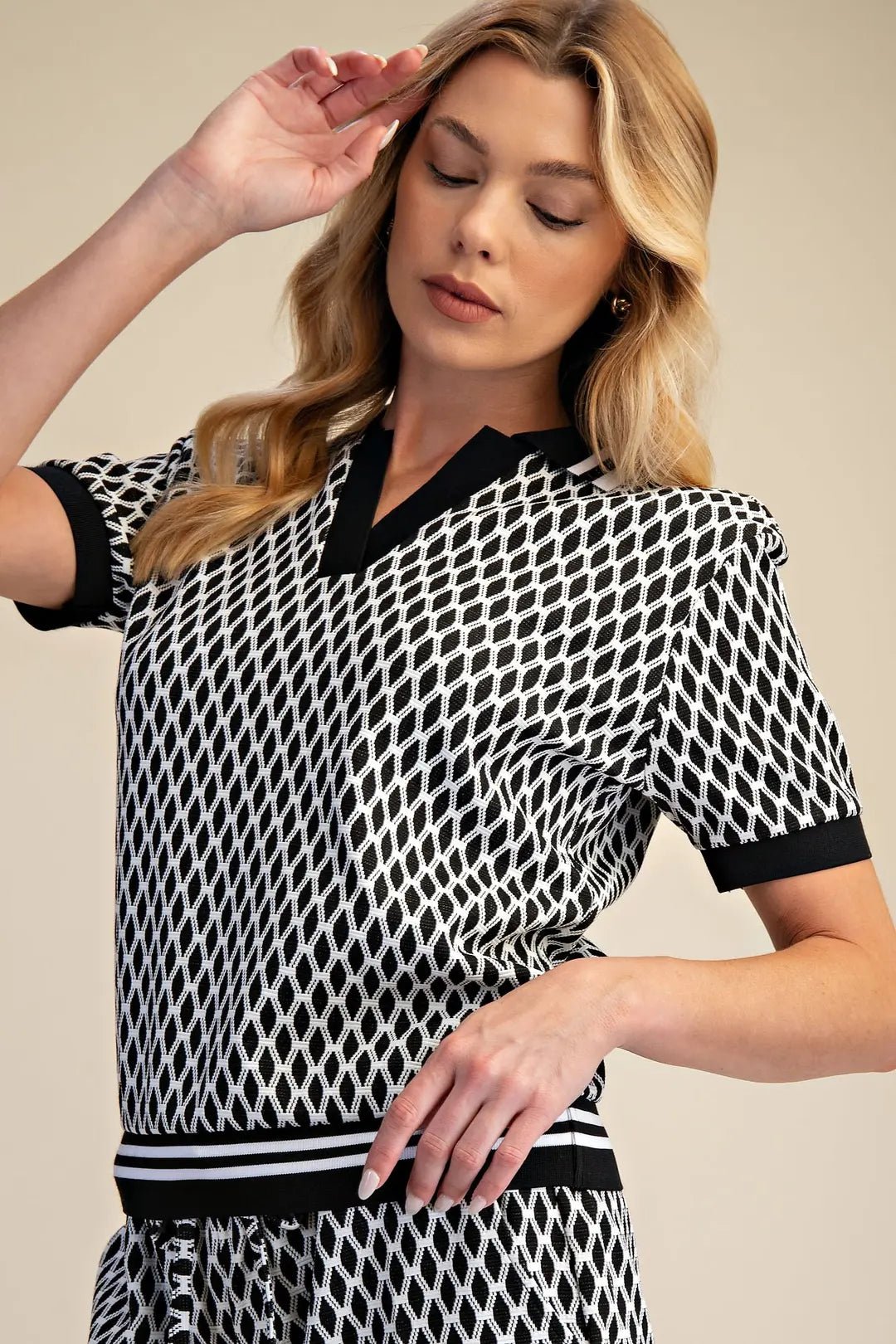 The Camille Weave is a modern knit designed for polished everyday dressing. Featuring a striking black-and-ivory geometric pattern, this top blends classic sophistication with contemporary structure. The tailored silhouette, contrast collar, and cuff detailing create a clean, elevated finish that feels both powerful and feminine.
