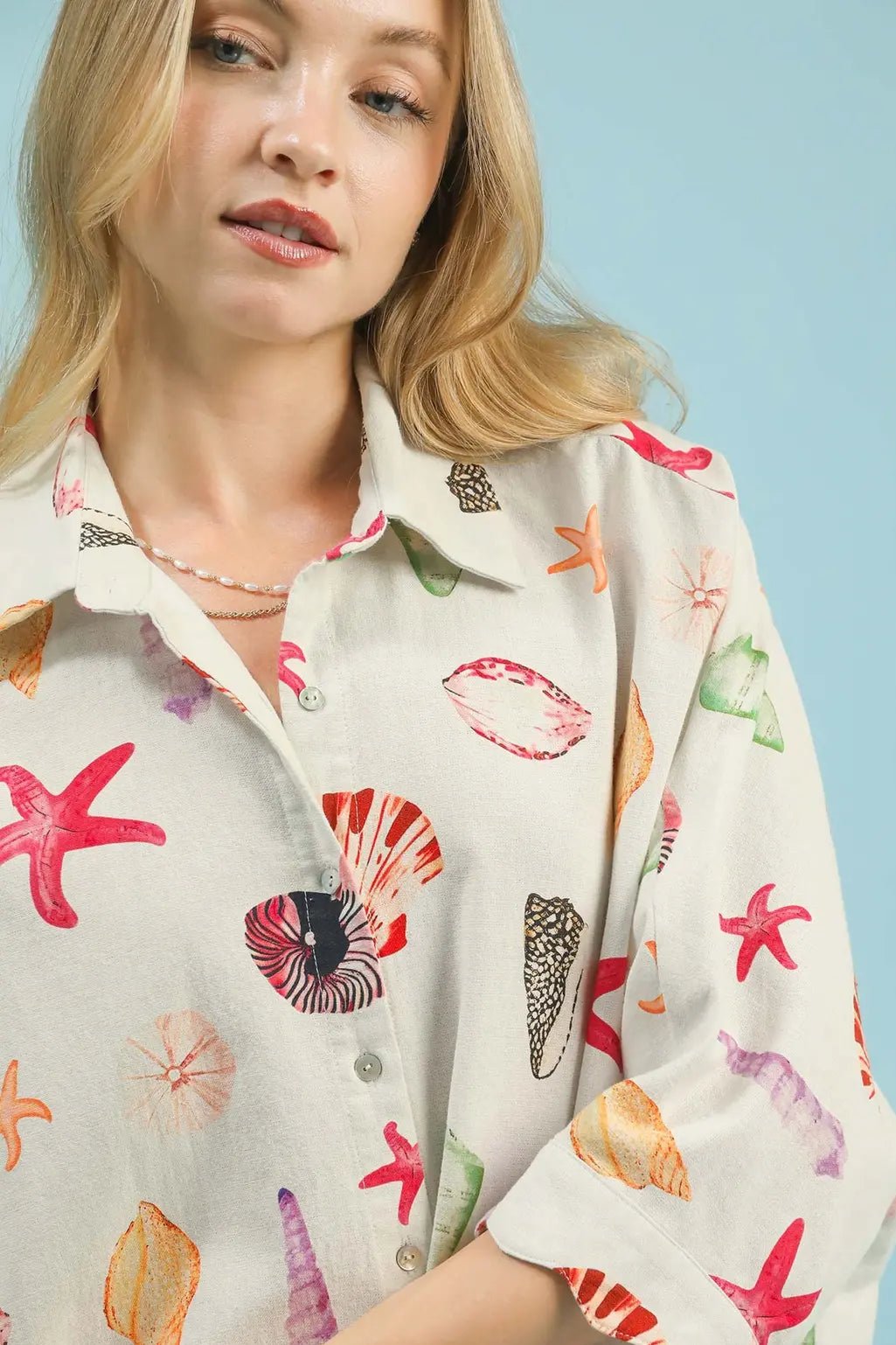 Dive into coastal vibes with this charming button-down top featuring whimsical seashell and starfish prints. Perfect for beach days, casual outings, or anyone who loves ocean-inspired style, this playful piece brings a splash of seaside personality to your wardrobe. The relaxed fit and easy-to-wear design make it an instant favorite for laid-back adventures. Whether you're heading to the shore or just dreaming of sandy toes, this top captures that breezy, carefree coastal spirit.