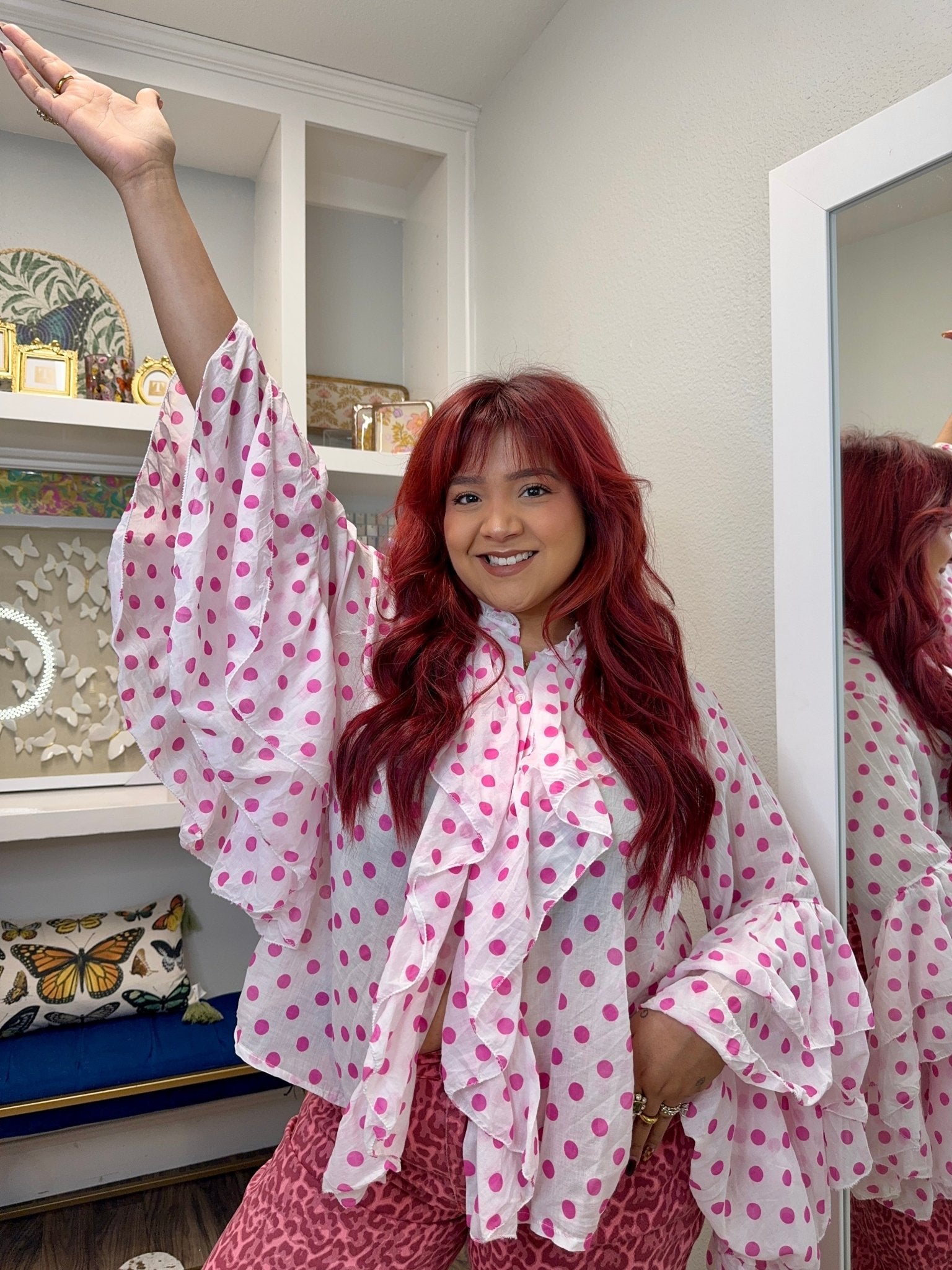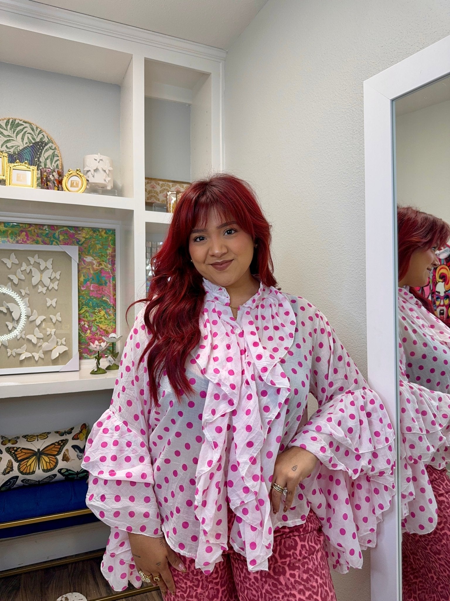 Sweet, flirty, and full of charm! 💗 This darling white blouse sprinkled with playful pink polka dots is giving major feminine flair. Featuring a soft ruffled neckline, cascading front ruffles, and breezy bell sleeves, it’s the perfect mix of romantic and fun. The lightweight feel keeps it comfy while the flowy silhouette adds a touch of effortless elegance. Dress it up with trousers or keep it casual with your favorite denim—either way, this blouse is ready to bring a little extra sparkle to your day! ✨🎀