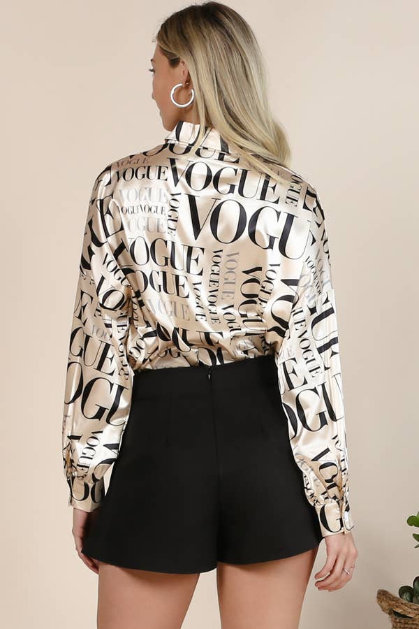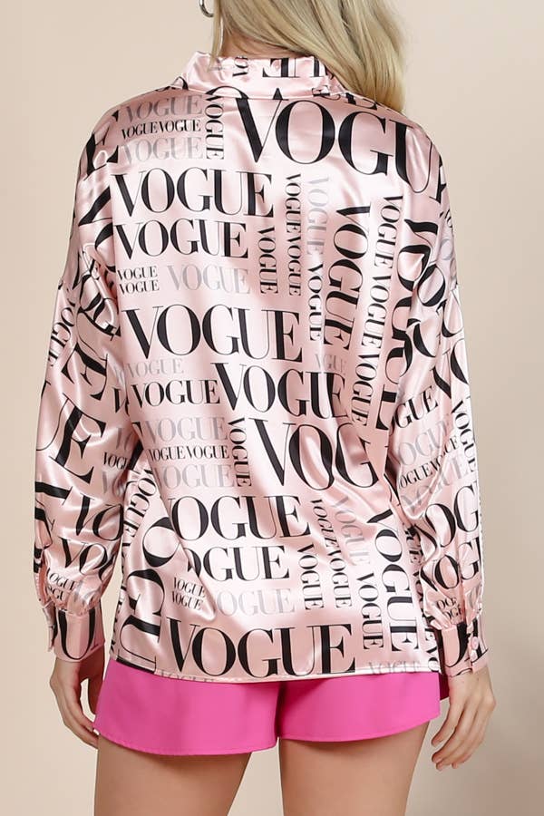 Slip into effortless elegance with this satin button-down that's equal parts chic and comfortable. Featuring a striking Vogue print collar, smooth satin fabric, and a relaxed loose fit, it's the perfect piece for elevating your everyday look. Long sleeves with functional buttons give you styling flexibility, whether you're dressing it up for a night out or keeping it casual. A wardrobe essential that feels as good as it looks.