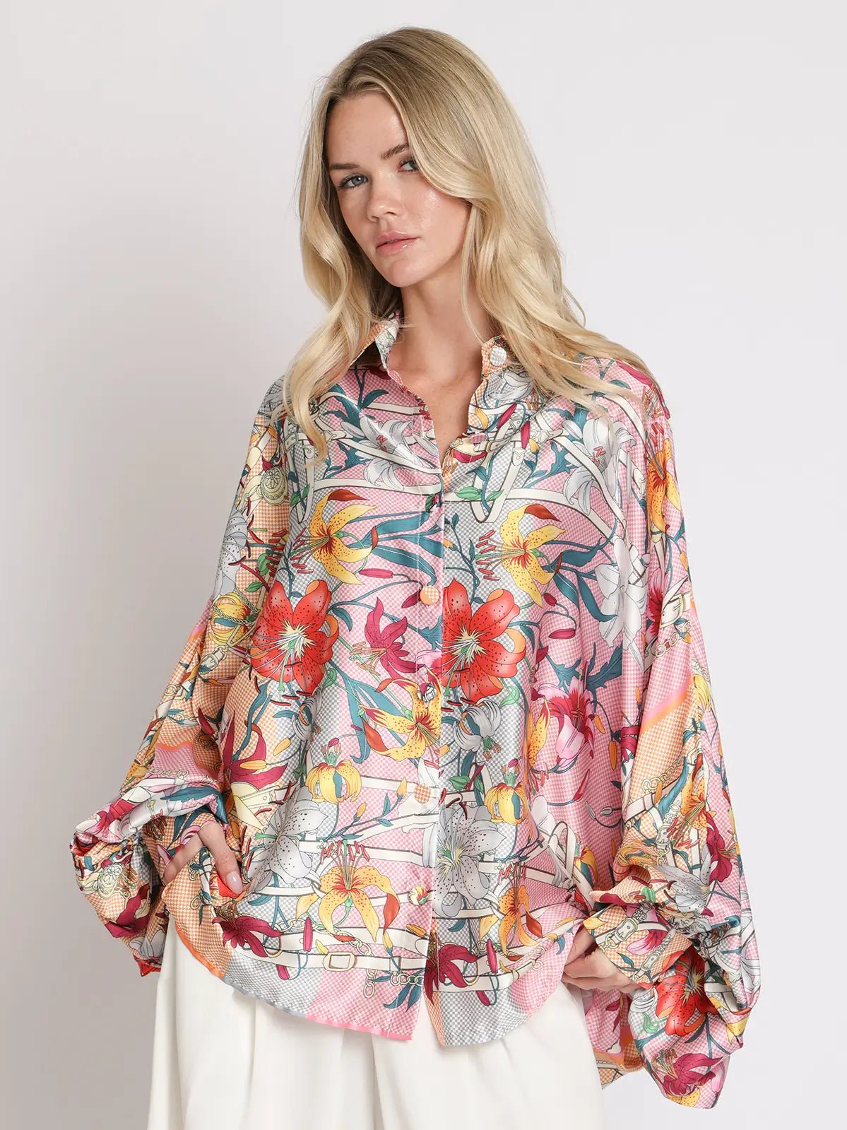 Modern Graphic Floral Printed Satin Blouse Satin fabric Modern graphic floral design Standard collar Fabric covered buttons Long batwing sleeve Double button cuffs Relaxed fit Imported Model is 5' 9" wearing ALL size *Holiday season style's at Beulah Style* For all your favorite gatherings and special occasions of the year, outfits for Thanksgiving, Christmas, to New Year's. Ending the year with the perfect party looks. Caring for your clothes is caring for the environment Wash your clothes with lower temperature and delicate spin cycles. It helps to maintain the color, shape and structure of the fabric. At the same time it reduces energy consumption that is used in care processes