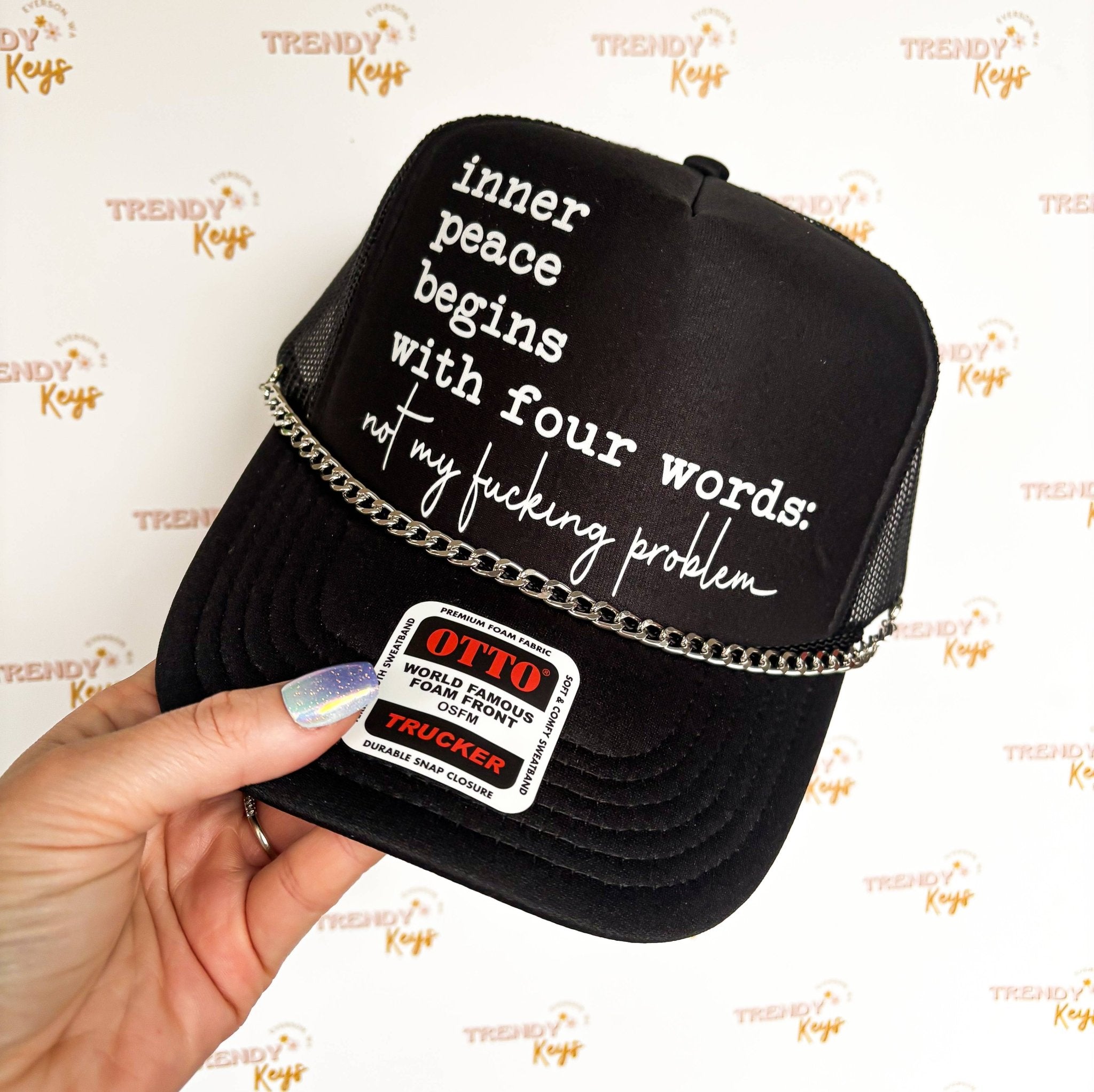 "Inner Peace Begins with 4 Words " trucker hat with a fun message and a touch of edgy flair. This hat features a mesh back for breathability and a chain detail for added style.