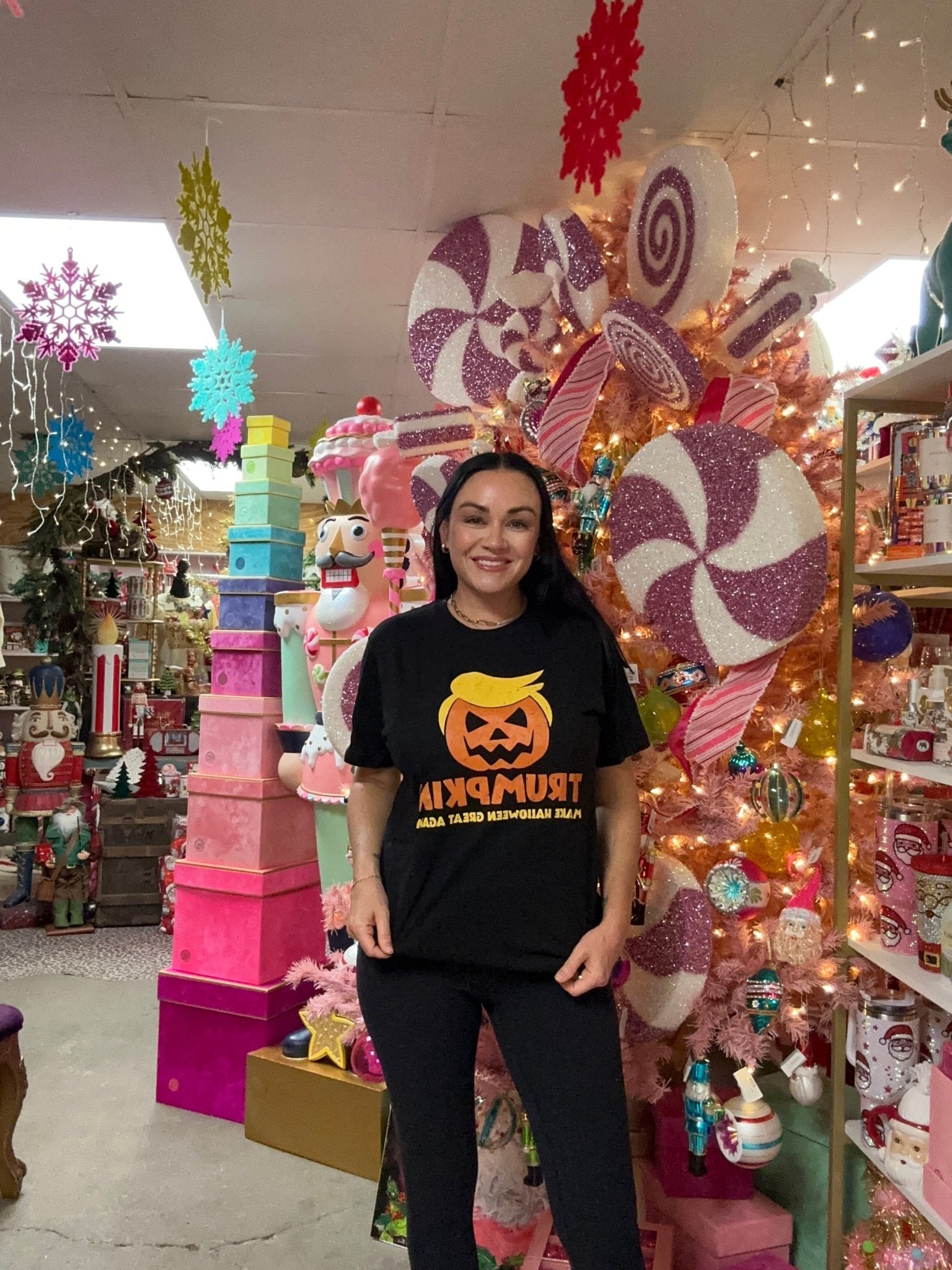 Get ready to turn heads and stir laughs this spooky season with the Trumpkin T-Shirt! This bold black tee features a hilarious illustration of Trump as a pumpkin — complete with the signature hair — and the cheeky slogan “Make Halloween Great Again”.
