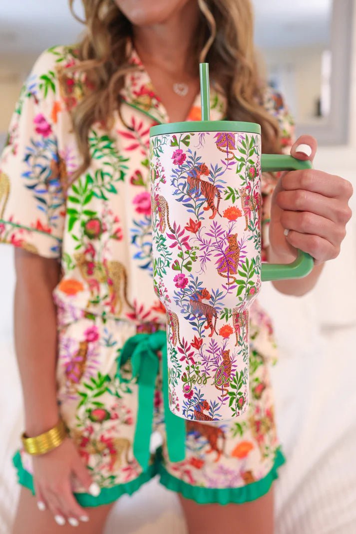 Stay refreshed with the vibrant Jungle Oasis Tumbler! Its colorful jungle design adds fun to every sip, while the 40-ounce size keeps you hydrated longer. Equipped with a reusable straw, a handy handle, and a screw-on lid, it’s perfect for busy days and car rides. Plus, it fits most cup holders and cleans up easily in the dishwasher—hydration just got a whole lot cooler!