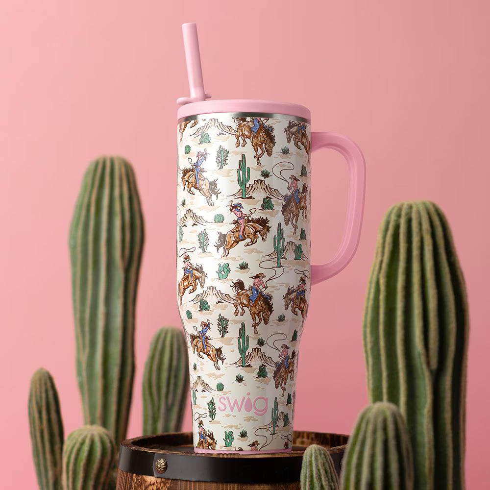 New lid, zero leaks, same great size! Get rodeo ready with this illustrated design of cowgirls riding bucking broncos, with desert scenery on a glitter ivory background.
