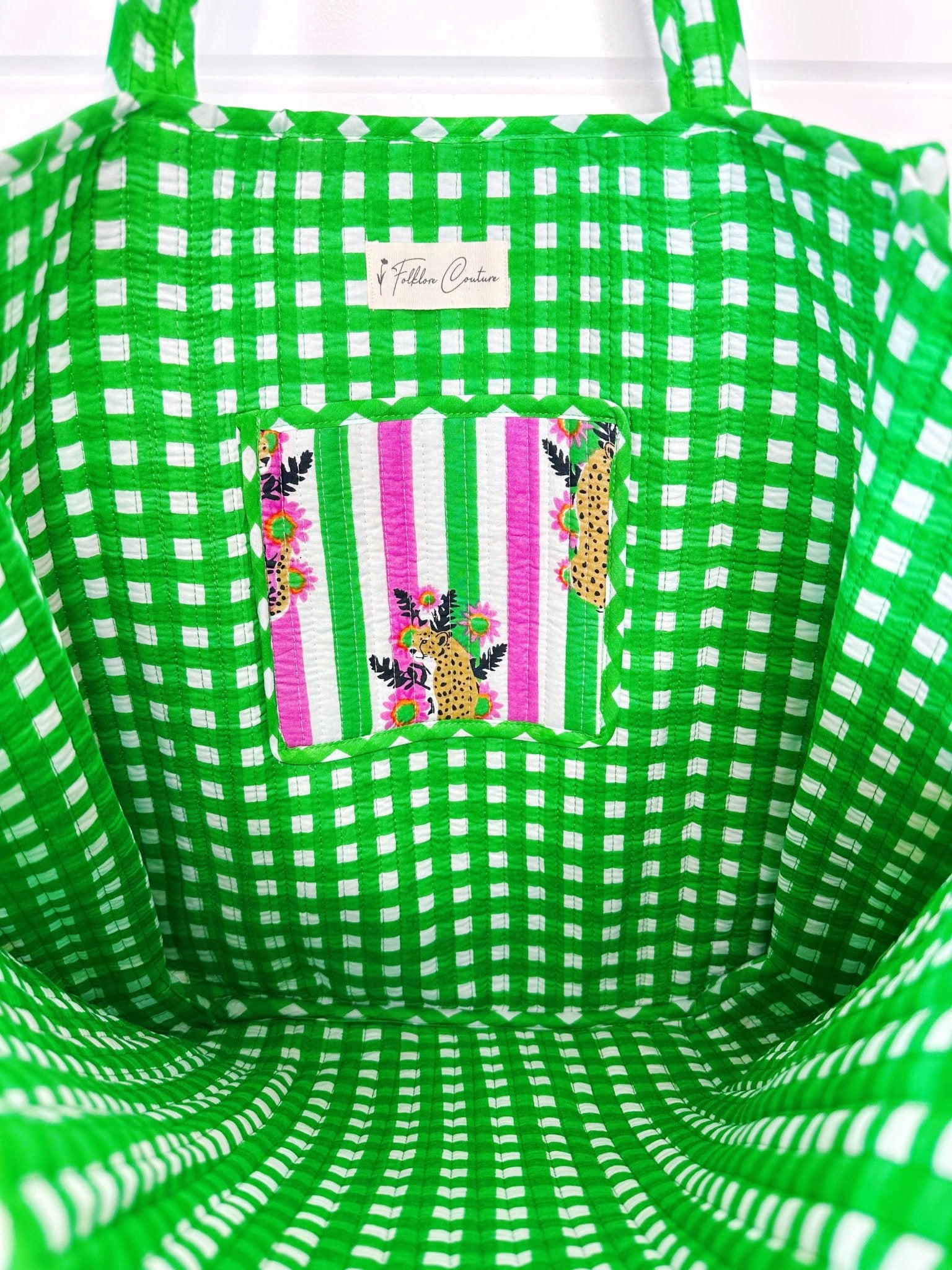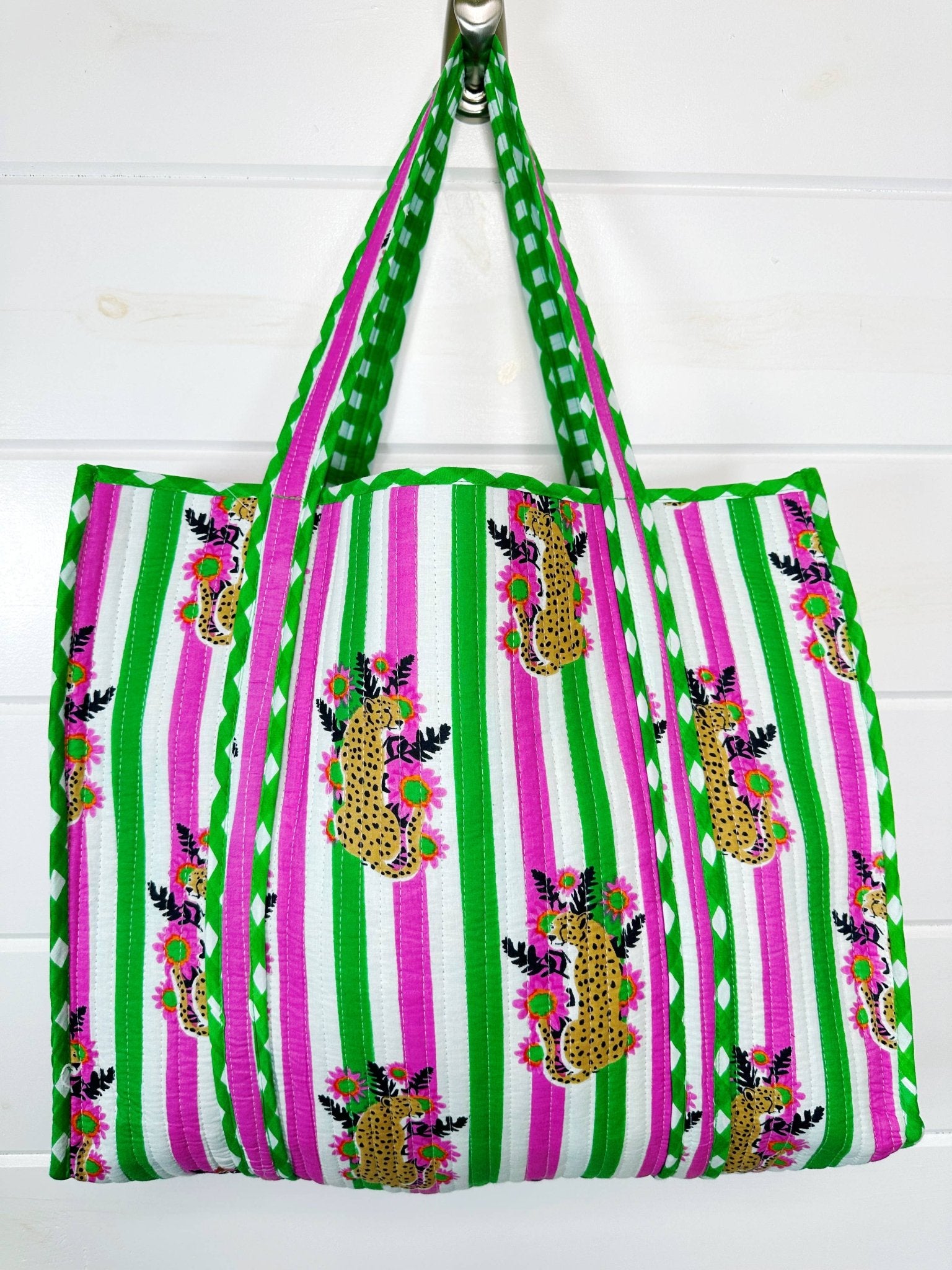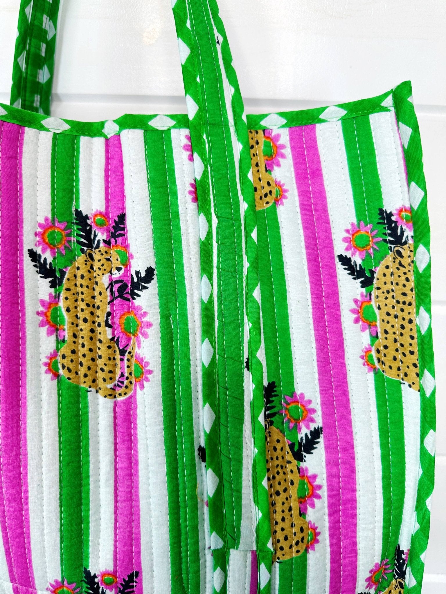 Pink and Green Jaguar Print Oversized Quilted Tote Bag: - Reversible tote with contrasting interior - Interior pocket - 17.5" x 17.5" - 100% Cotton - Quilted block print fabric Perfect for: market tote, beach tote bag, weekender bag, overnight bag, large shopping tote, travel bag & more! Great to sell for gift shop items, upscale boutiques, birthday gifts, embroidery blanks & more! Our quilted pieces are handmade by Indian artisans. The cotton fabrics are handprinted and proudly sustainably made.