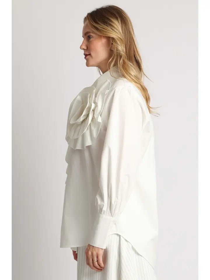 Elevate your wardrobe with this striking longline shirt featuring dimensional 3D floral embellishments and delicate ruffled detailing. The extended length provides modern coverage and versatile styling options, while the textured florals add visual interest and dimension. Perfect for layering or wearing solo, this piece combines contemporary design with feminine flair. Ideal for those seeking statement-making basics that transition effortlessly from day to evening wear.