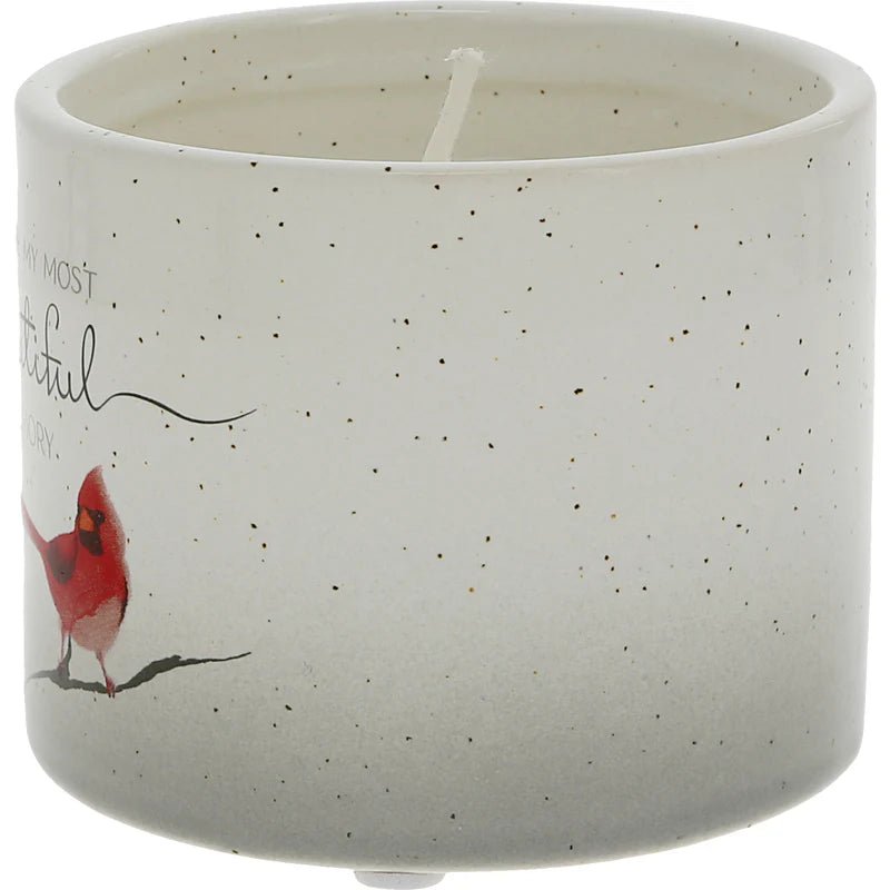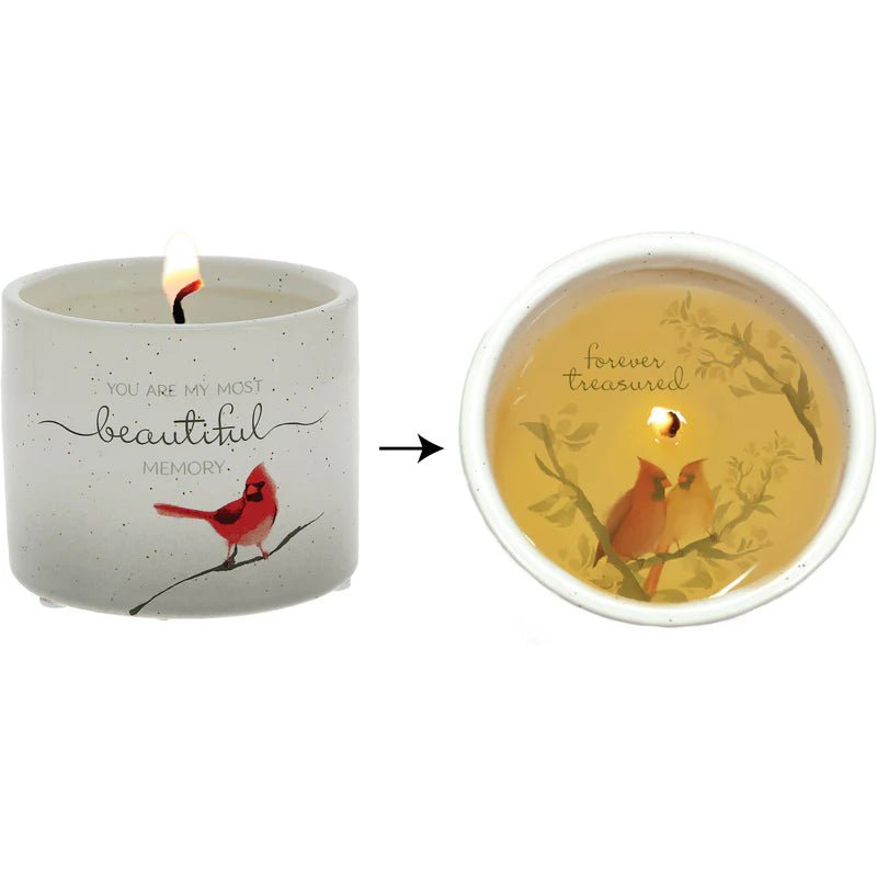Light this 8 oz soy wax candle and watch magic unfold! As the flame dances, a hidden design gradually reveals itself—delicate cherry blossoms, a cardinal pair, and "Forever Treasured" emerge like a beautiful secret. The jasmine tranquility scent wraps your space in calm while the organic ceramic vessel adds modern elegance to any room. With a 21-24 hour burn time and eco-friendly cotton wicks, this memorial candle becomes a cherished ritual. Each burn brings the design back to life, creating moments of wonder and remembrance.