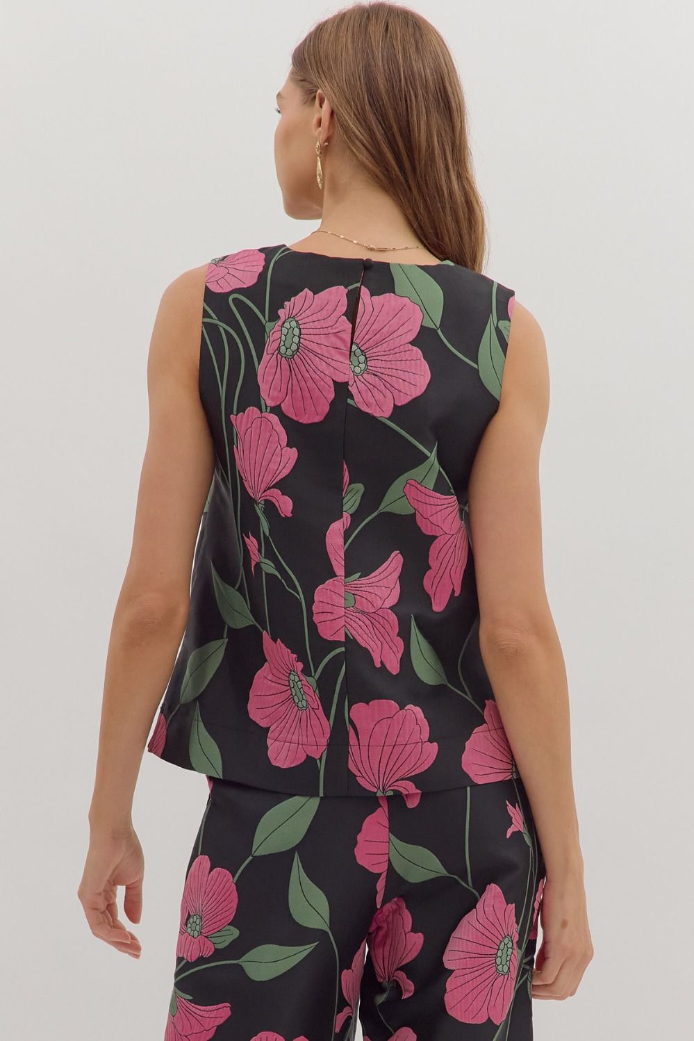Elevate your wardrobe with the Black Blossom Sleeveless Top, a delicate blend of elegance and effortless style. This sleeveless blouse features a black base adorned with soft pink floral prints, perfect for a feminine touch. A subtle back keyhole with button closure adds a refined detail, while the lightweight woven fabric keeps it airy and comfortable.
