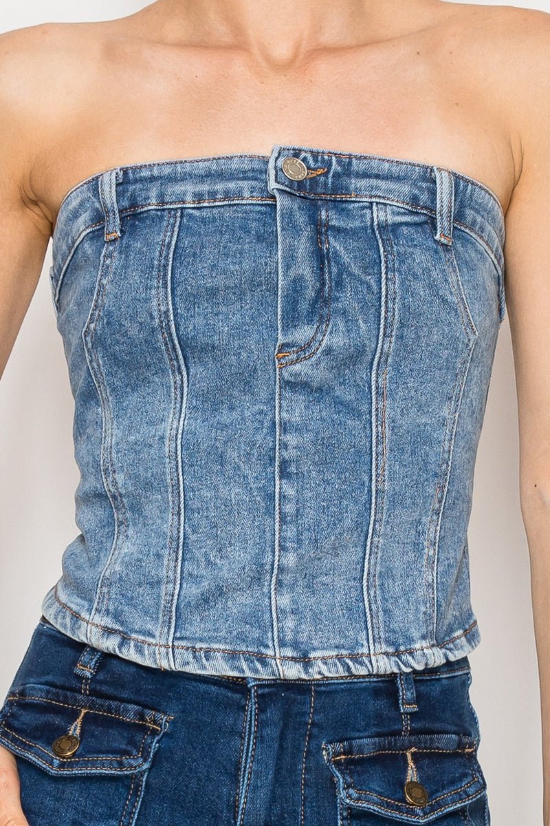 Edgy and effortless, this acid wash denim tube top features a sleek zippered front for easy styling versatility. The vintage-inspired blue wash adds character to any casual look, while the fitted tube silhouette creates a flattering, contemporary vibe. Perfect for layering or wearing solo, this piece transitions seamlessly from day to night. Pair with high-waisted jeans or a mini skirt for an instant cool-girl aesthetic.