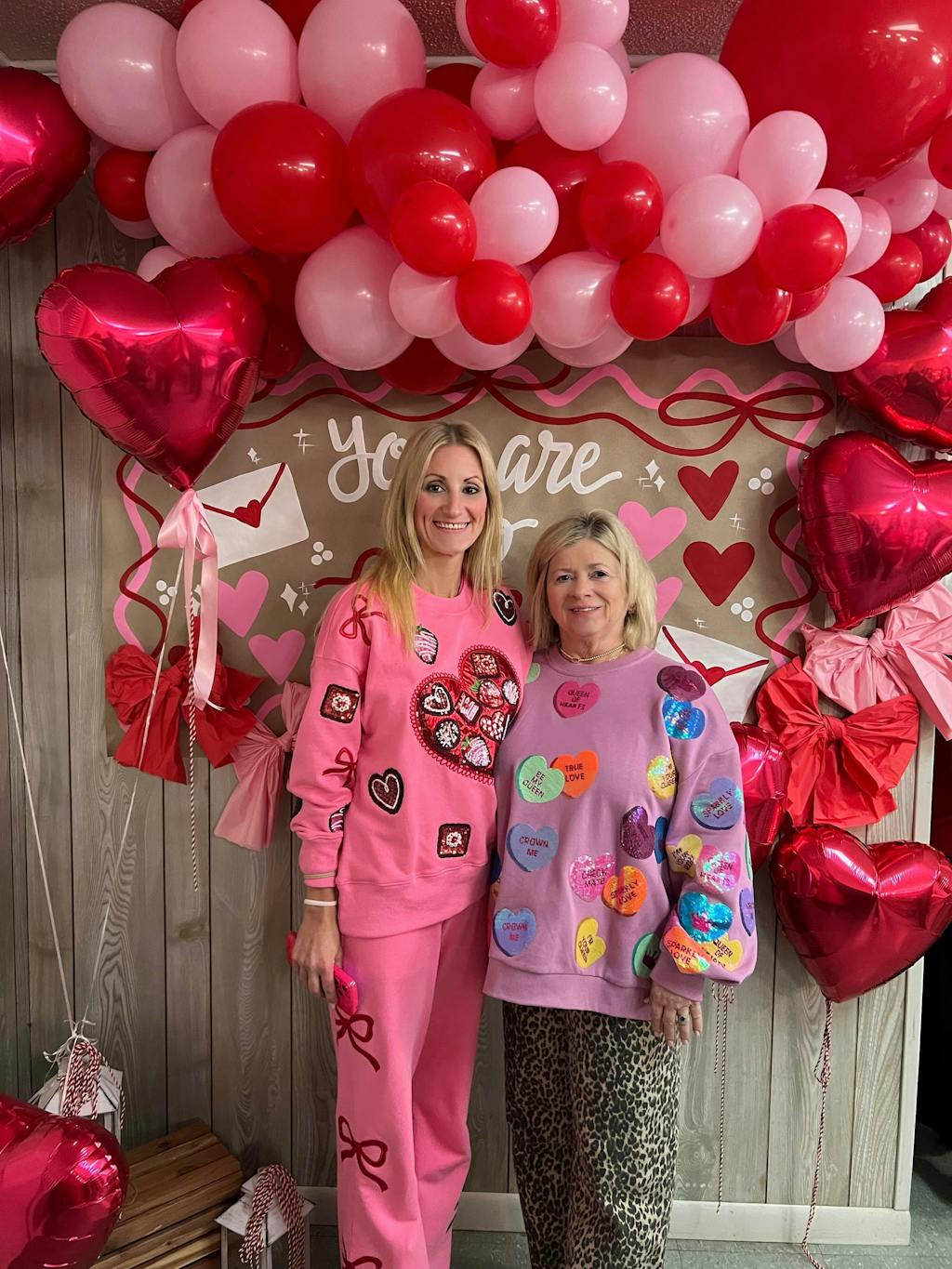 Pink sweatshirt featuring an oversized heart artwork inspired by a box of chocolates, detailed with sequins, embroidery, and fabric appliqué
