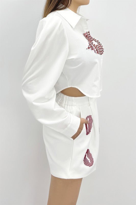 Make a statement with the Diamond Kiss Top, a cropped-length button-front shirt that combines playful style with timeless elegance. Bold rhinestones frame a striking lip-graphic at the front, catching light with every move. Classic shirt collar and puffed long sleeves deliver a sophisticated silhouette that works for both casual outings and dressed-up occasions. Perfect for anyone looking to add personality and sparkle to their wardrobe.