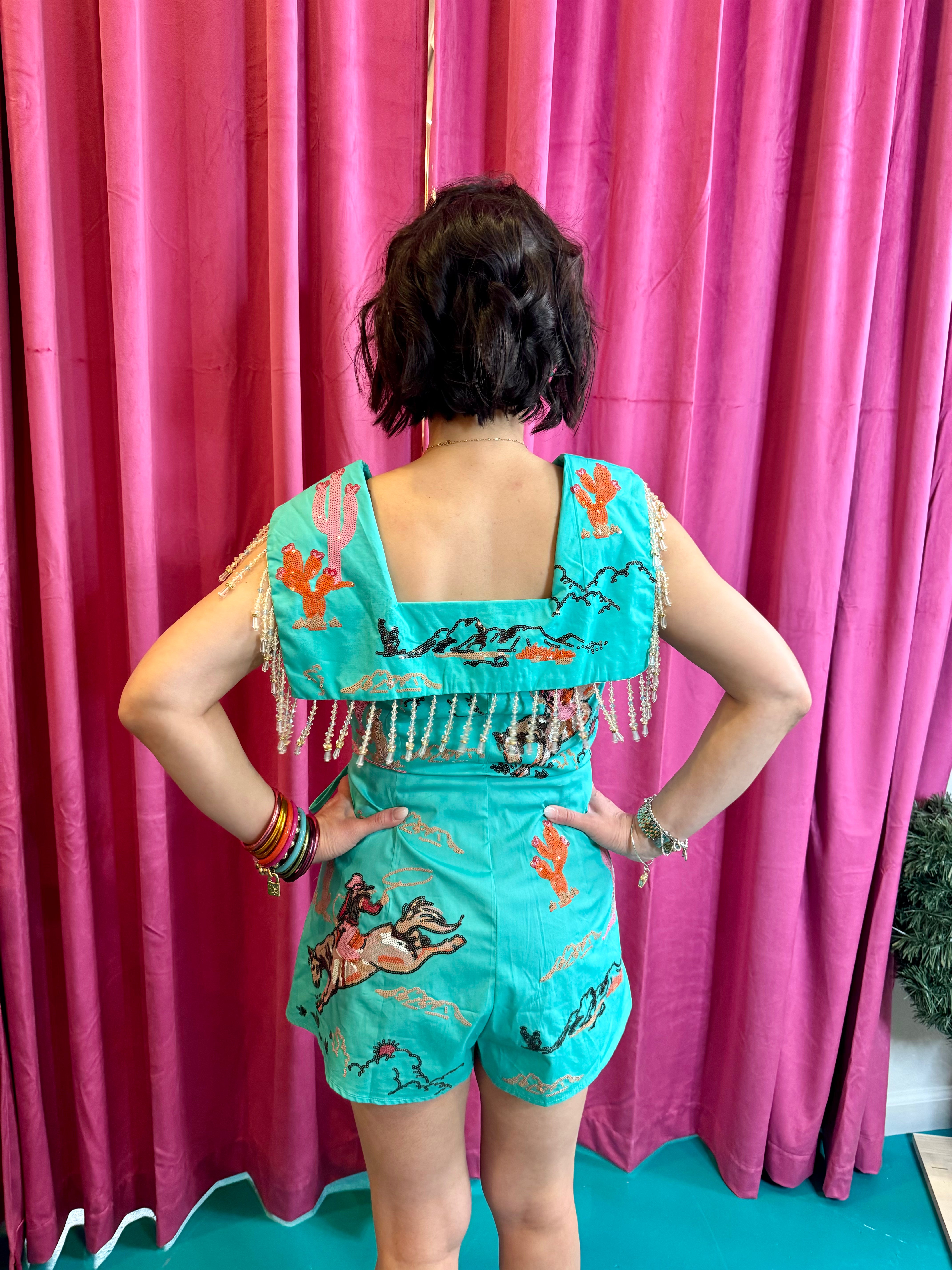 The QOS Aqua Bucking Cowgirl Beaded Fringe Tie Collar Cotton Romper combines traditional design elements with modern fabric technology. Made from 100% cotton, it offers breathability and comfort. The beaded fringe detail enhances aesthetic appeal, making it suitable for casual outings or themed events. This romper promotes ease of movement, ensuring flexibility throughout wear.