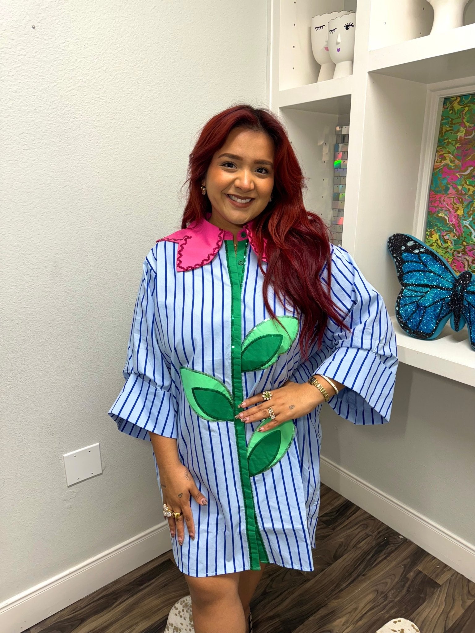 Introducing the Queen of Sparkles Pale Blue Striped Flower Collar Button Up Cotton Tunic – where whimsy meets wardrobe staple! This charming tunic features delicate pale blue stripes paired with an enchanting flower collar that instantly elevates your everyday look. Crafted from soft, breathable cotton, it's perfect for staying comfortable while turning heads. The classic button-up design offers effortless styling versatility, whether you're dressing it up for brunch or keeping it casual for weekend adventures. A playful piece that proves fashion should always be fun!
