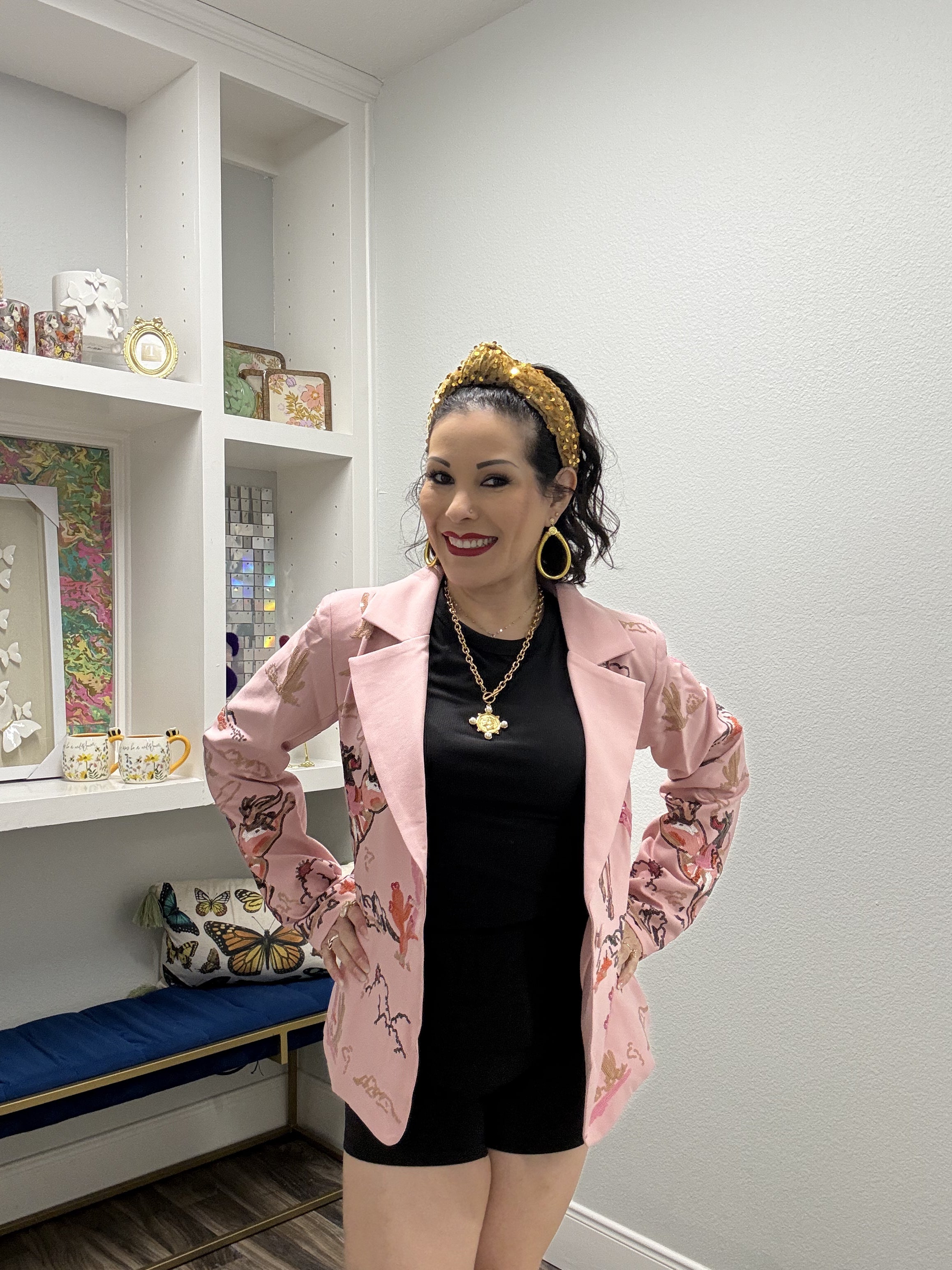 Saddle up in style with this light pink bucking cowgirl blazer that's ready to steal the show. Featuring eye-catching sparkle details and a bold Western silhouette, this statement piece channels rodeo glamour with a modern twist. Perfect for anyone who wants to ride into any occasion with confidence and flair. Whether you're hitting the dance floor or making a grand entrance, this blazer proves that cowgirl chic never goes out of style. Model is wearing an XS