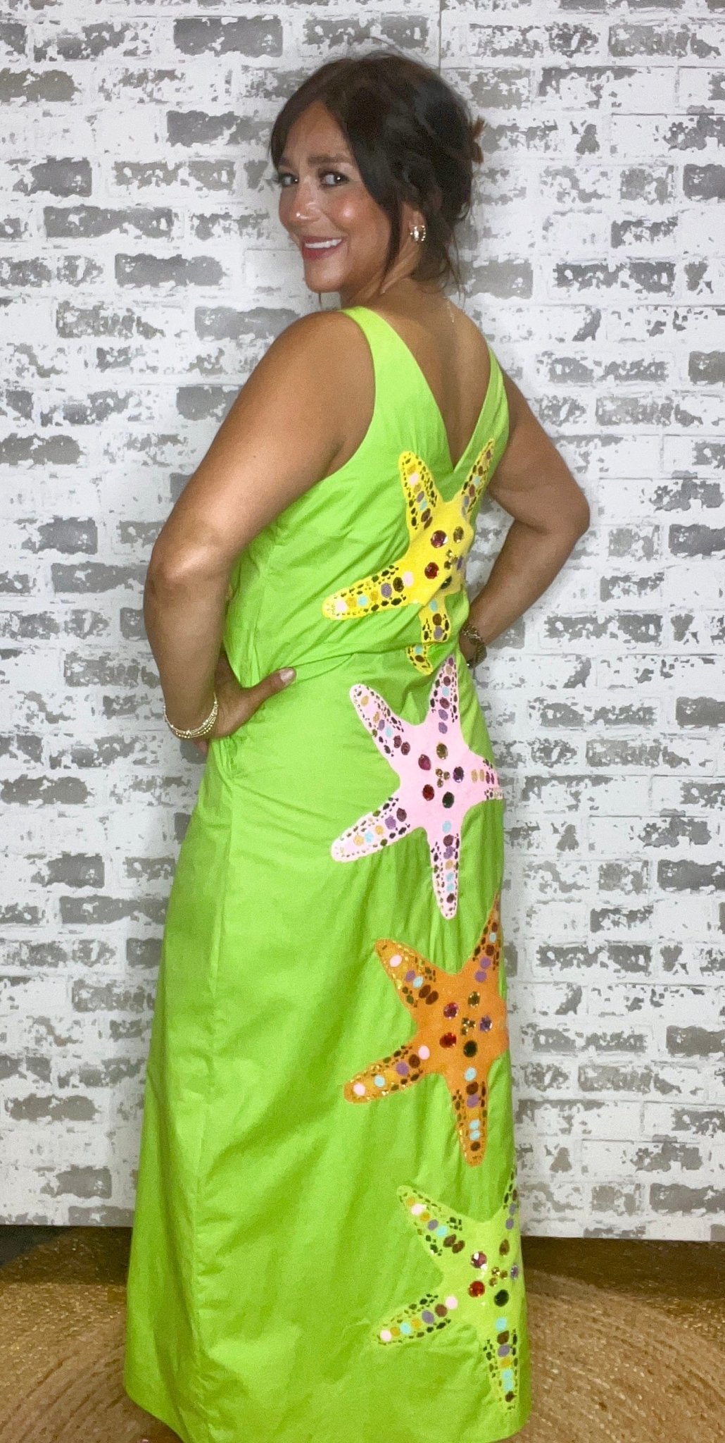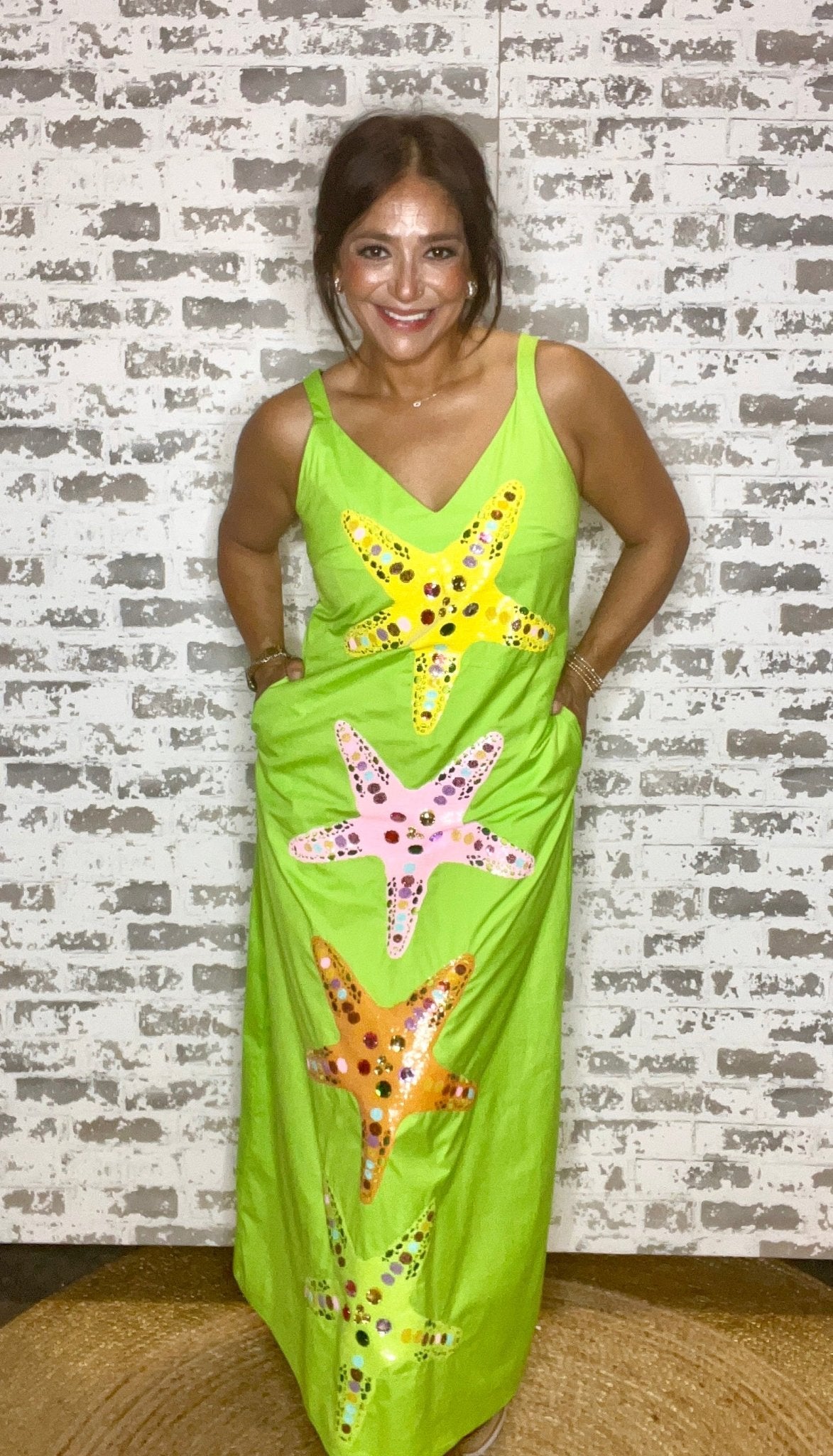 A true knockout for a summer dress! WOW yourself and grab the new Queen of Sparkles •QOS • Lime Green Multi Star Fish Midi Cotton Dress!!