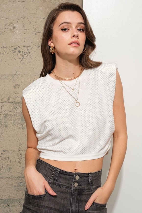 Elevate your evening look with this cropped top designed to make a statement. Featuring structured shoulders that command attention and an all-over sparkle finish, this piece transforms any night into something magical. The cropped silhouette offers a modern, flattering fit perfect for dressing up or down. Whether you're heading out for a special occasion or want to add shimmer to your everyday style, this top delivers effortless glamour with every wear.