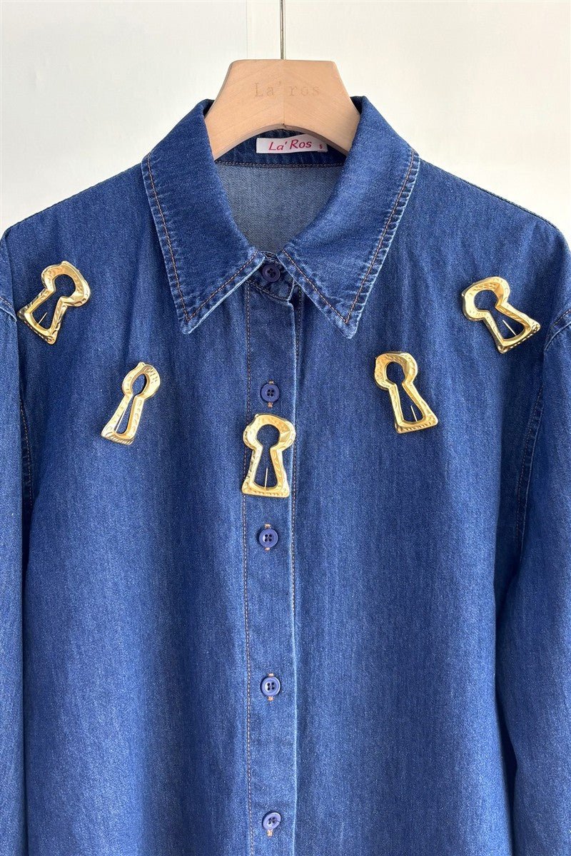 Effortless sophistication meets everyday comfort in this classic denim blouse. Featuring a relaxed button-down silhouette with long sleeves perfect for layering through any season, it's designed for versatile styling. Distinctive gold-tone keyhole appliques add a refined touch of detail that elevates the timeless denim aesthetic. An essential piece that transitions seamlessly from casual to polished looks.