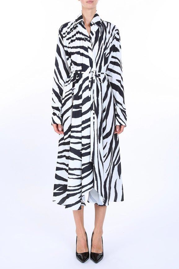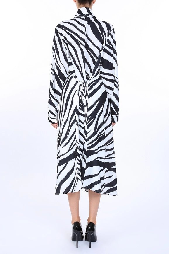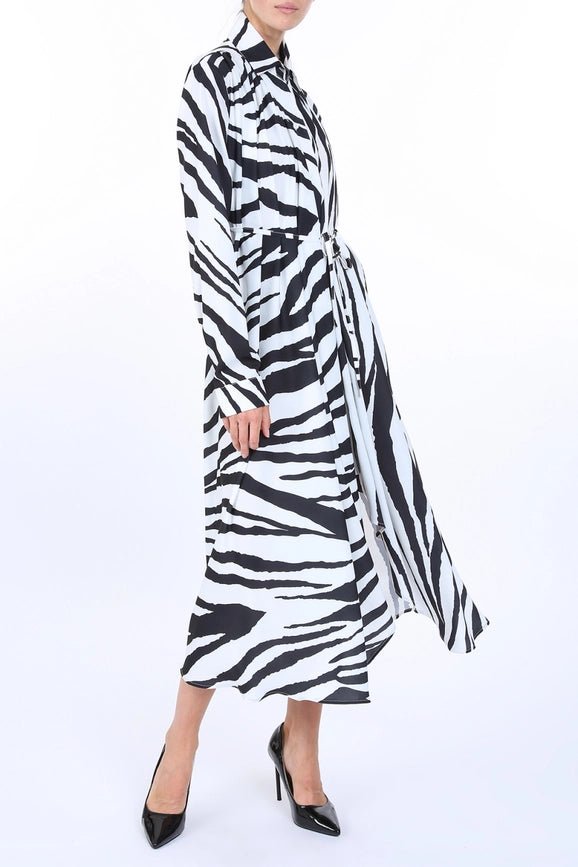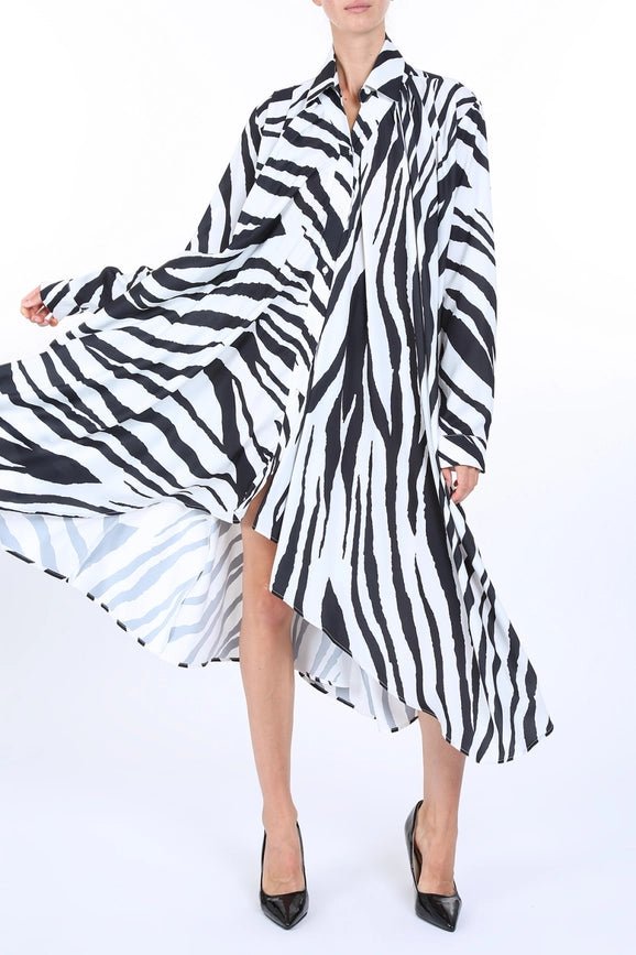 Satin midi shirt dress with an A-line silhouette and zebra print